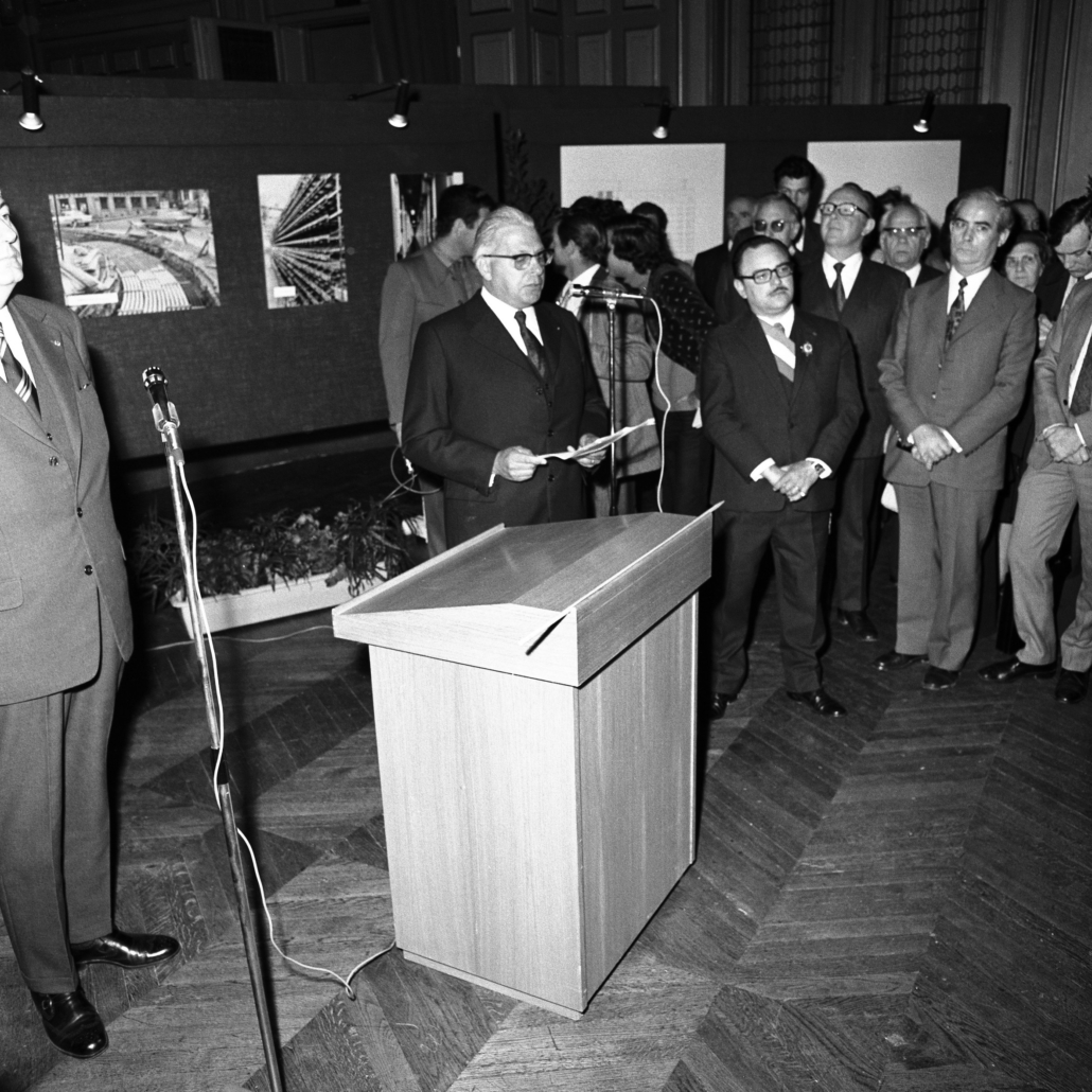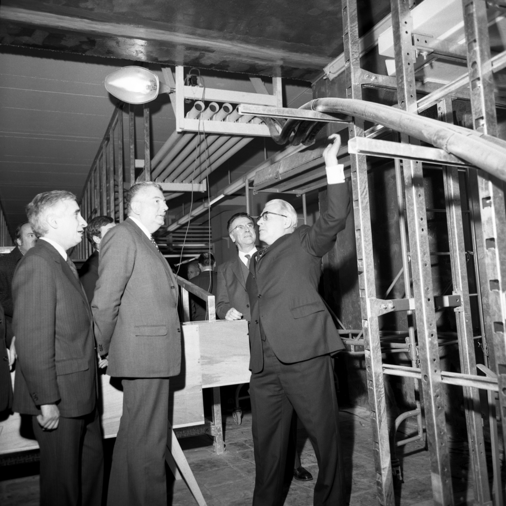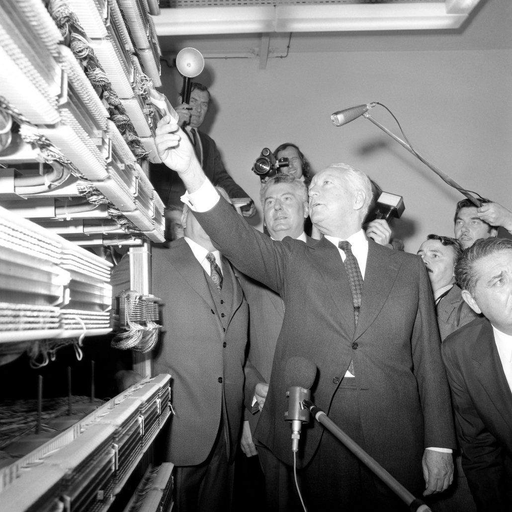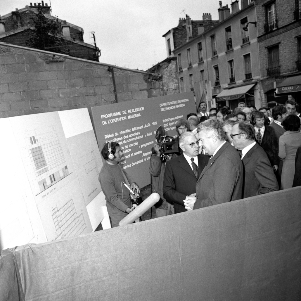 Ci-dessus : inauguration solennelle du Centre Téléphonique Tuileries par M. le Premier Ministre – Pierre Messmer, entouré de hautes personnalités.