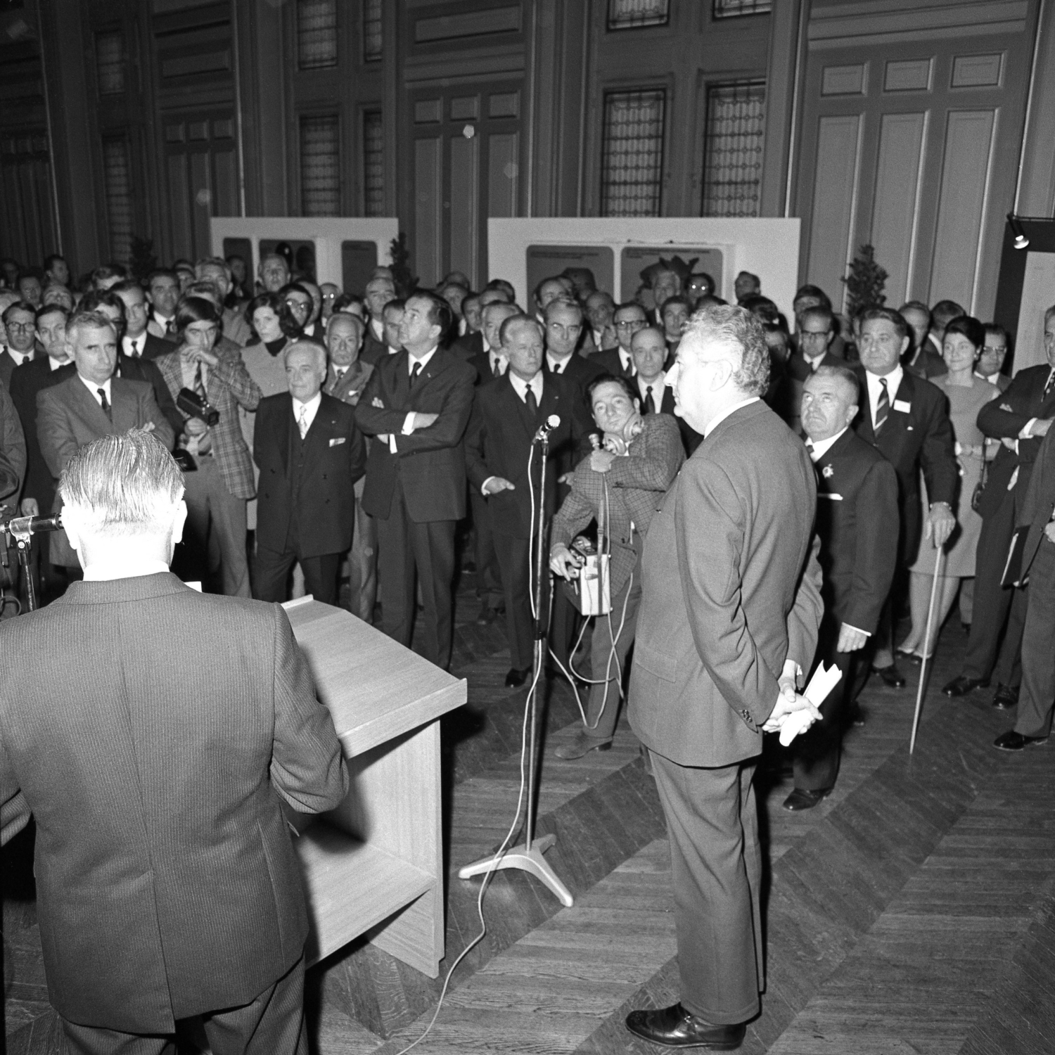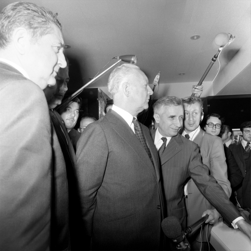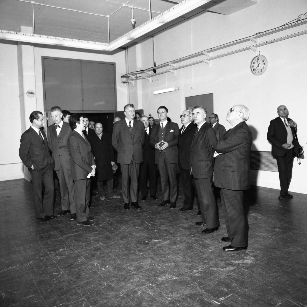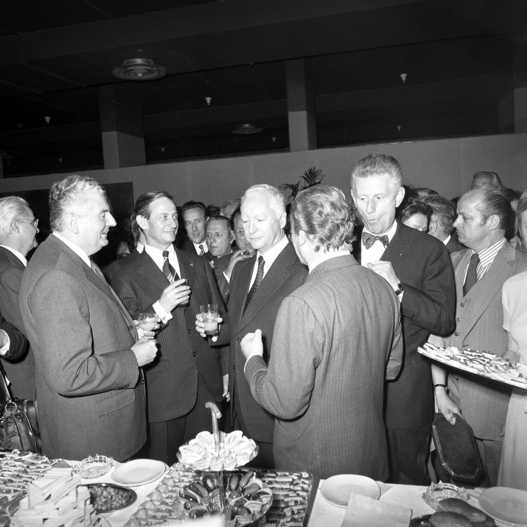 - cliché 8 : le pot de l’amitié où l’on reconnaît de g-à-d M. le Ministre des P et T – Hubert Germain ; M. le Ministre des Armées – Robert Galley ; M. le Premier Ministre – Pierre Messmer ; M. l’Architecte – Marc Saltet (nœud papillon) et M. le Ministre des Affaires Culturelles – Maurice Druon (de dos).