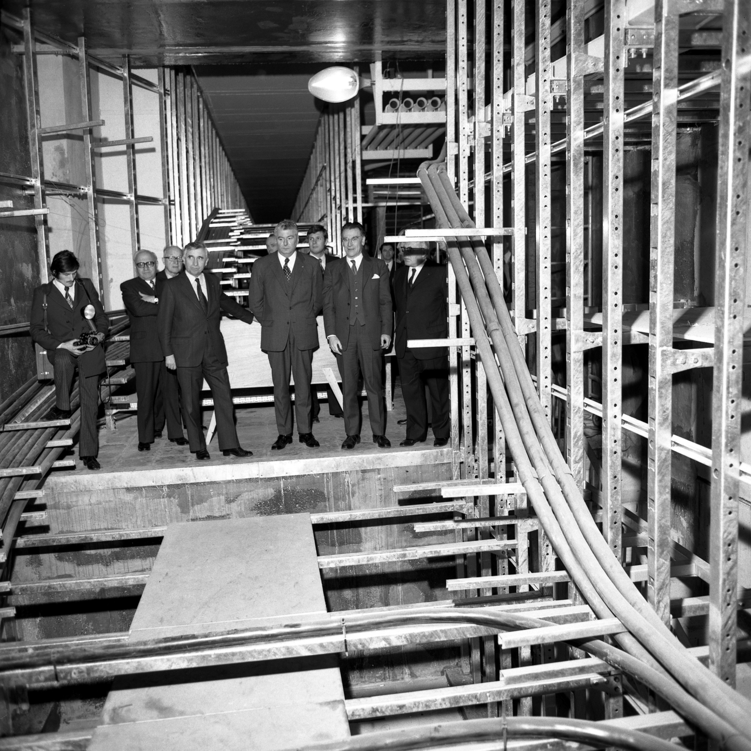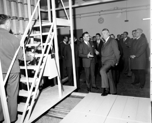 - Sur cliché 5, M. le Ministre des P et T mettant un pied sur le caillebotis métallique du Répartiteur d’Abonnés, côté Têtes Verticales (qui sont reliées aux abonnés) ; et M. l’Ingénieur Général des Télécommunications – Jean Briend qui lui parle à cet instant.
