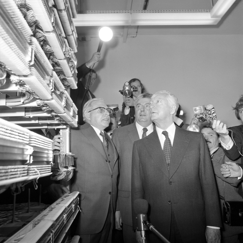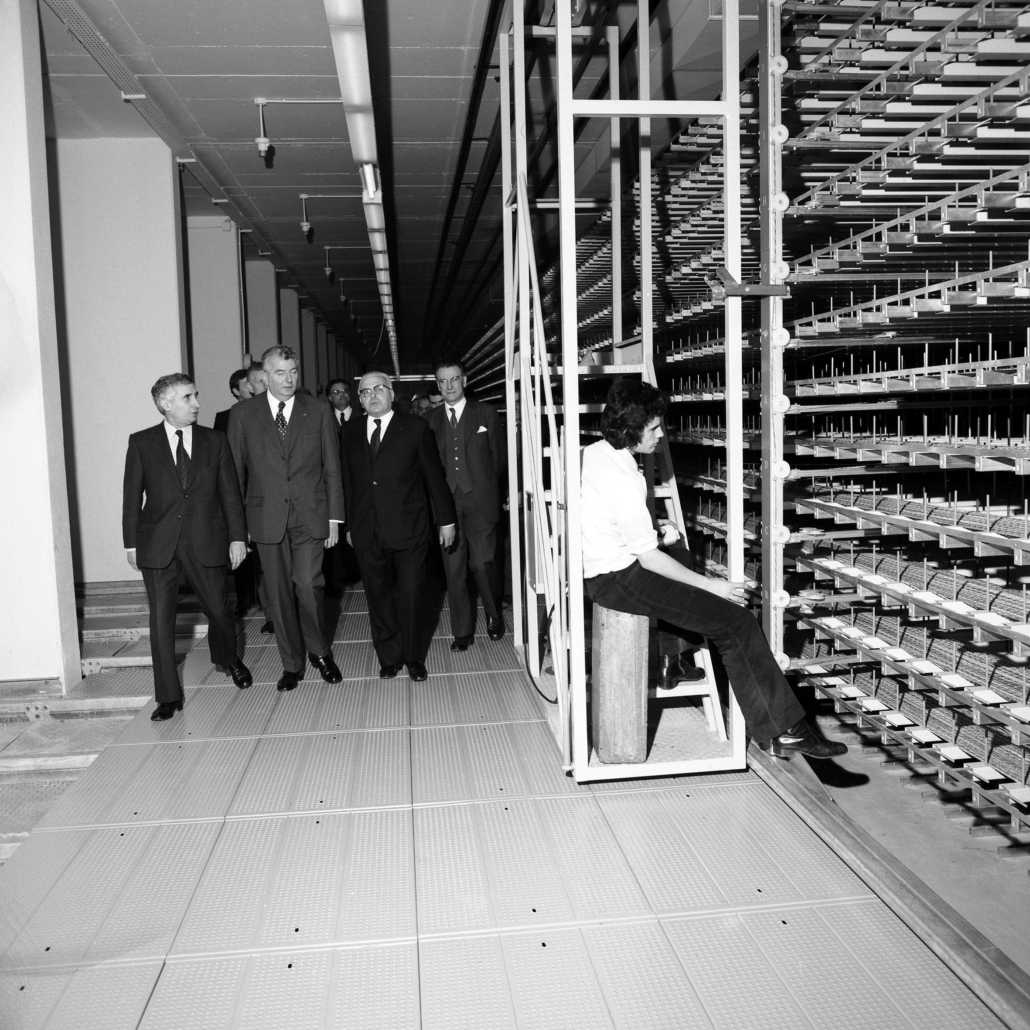 - cliché 7, de gauche à droite : M. le Premier Ministre – Pierre Messmer, M. le Ministre des P et T – Hubert Germain ; M. le Directeur Général des Télécommunications – Louis-Joseph Libois ; M. le Ministre des Armées – Robert Galley visitent le Commutateur téléphonique PENTACONTA 1 PC1 (AE21), mis en service, en réalité, depuis le 12 avril 1973…