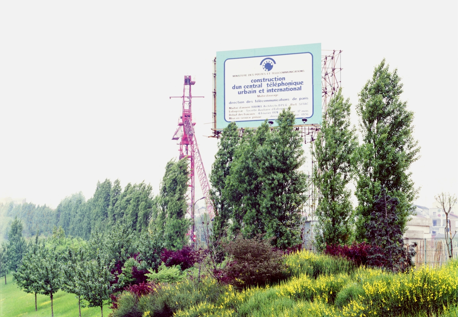 Ci-dessus : panneau public du chantier du Centre Téléphonique de Neuilly-sur-Seine en cours en 1978. (agrandissement)