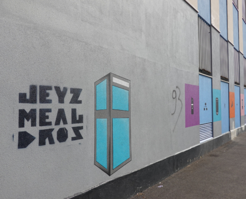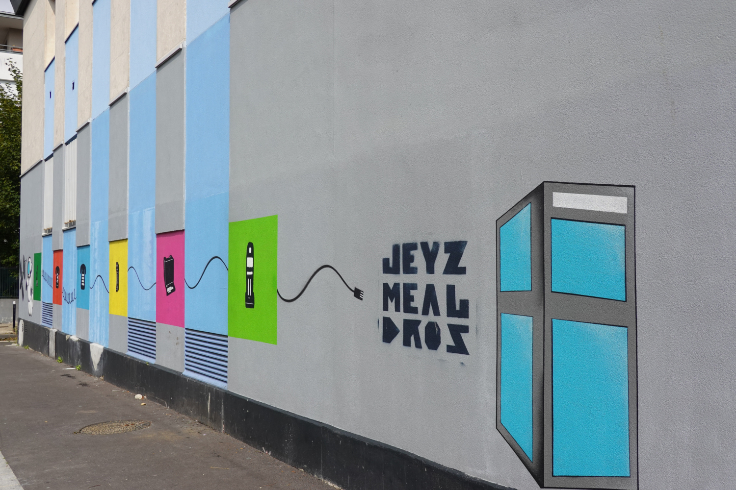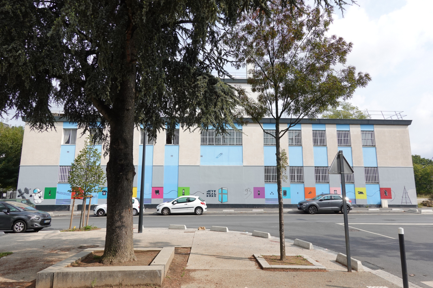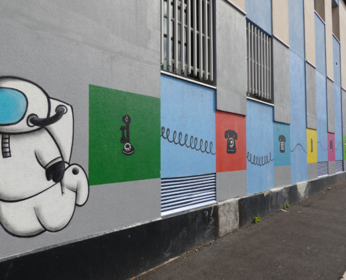 Ci-dessus : Centre Téléphonique de Montfermeil (93), dont la façade principale a été décorée par les collégiens/lycéens de cette ville d’un ensemble de fresques chronologiques récapitulant fidèlement l’histoire des Télécommunications, du Manuel à l’Automatique, du RTC à l’ADSL, en passant par la Publiphonie, la Télématique, le Radiotéléphone, etc…