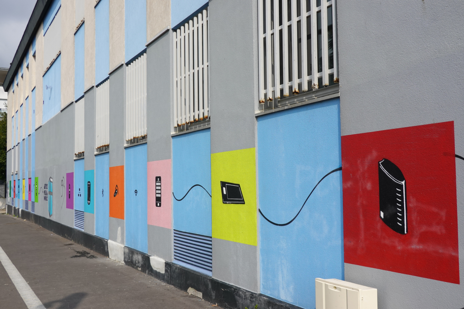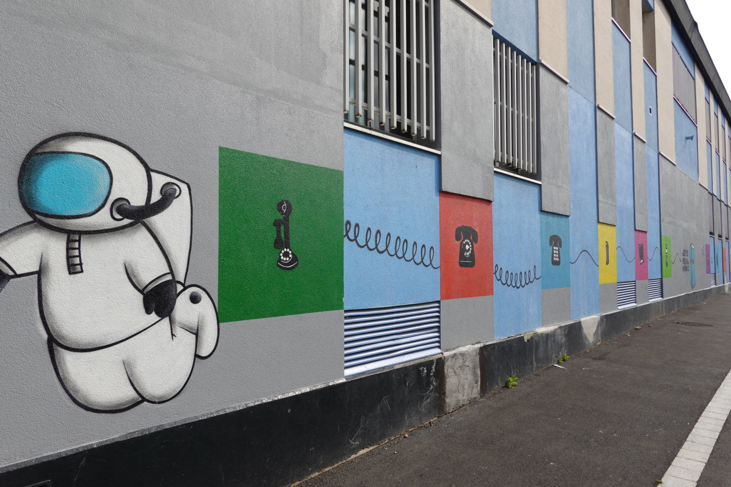 - Arrivé sur place, je découvris un centre récemment repeint, dont la façade principale venait, de surcroît, d’être décorée par les collégiens/lycéens de cette ville, sous forme de fresques chronologiques récapitulant fidèlement l’histoire des Télécommunications, du Manuel à l’Automatique, du RTC à l’ADSL, en passant par la Publiphonie, la Télématique, le Radiotéléphone, etc…