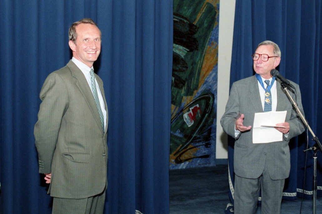 Ci-dessus : M. Marcel Roulet reçoit à Stockholm des mains de S.M. le Roi de Suède – Carl Gustav XVI, le prix de la meilleure entreprise française le 13 septembre 1994. Photographie France Télécom – Coll. C. R-V.