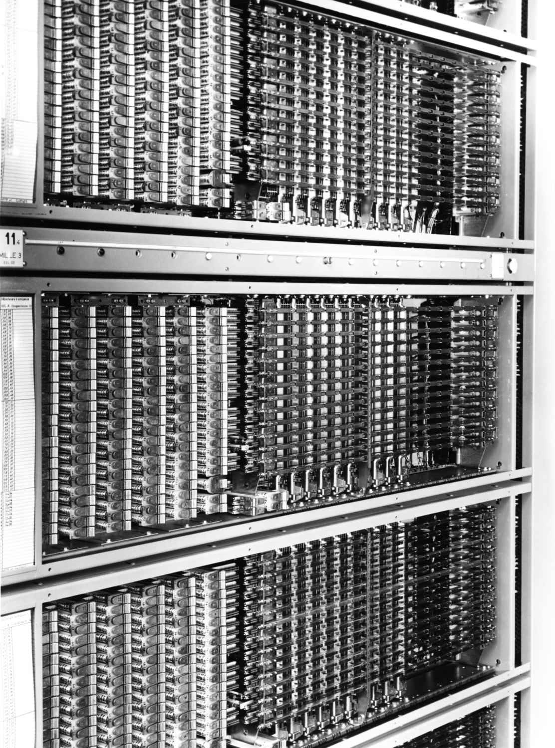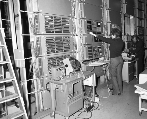 Ci-dessus : baies d’une Unité de Commande Électronique à microprocesseurs venant en remplacement d’une Unité de Commande Électromécanique, dans un Commutateur Crossbar CP400.