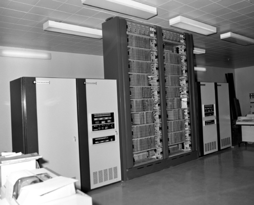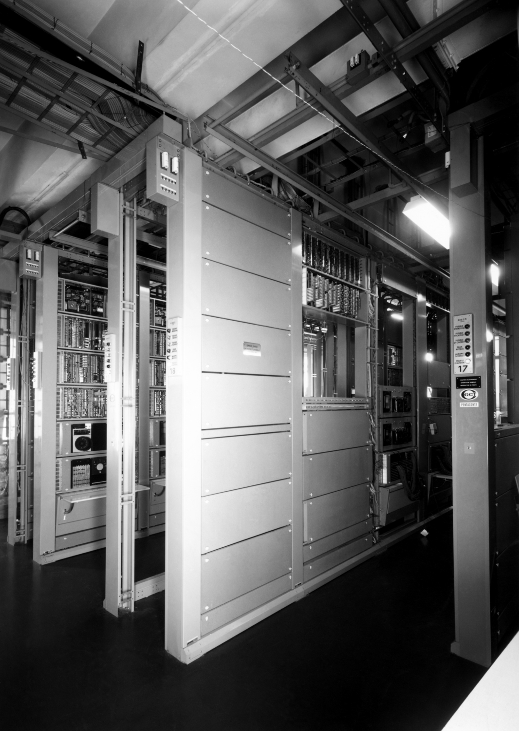 - à gauche : travée d’un Commutateur PENTACONTA Nord (CPE Paris-Nord) dans les années huitante.
