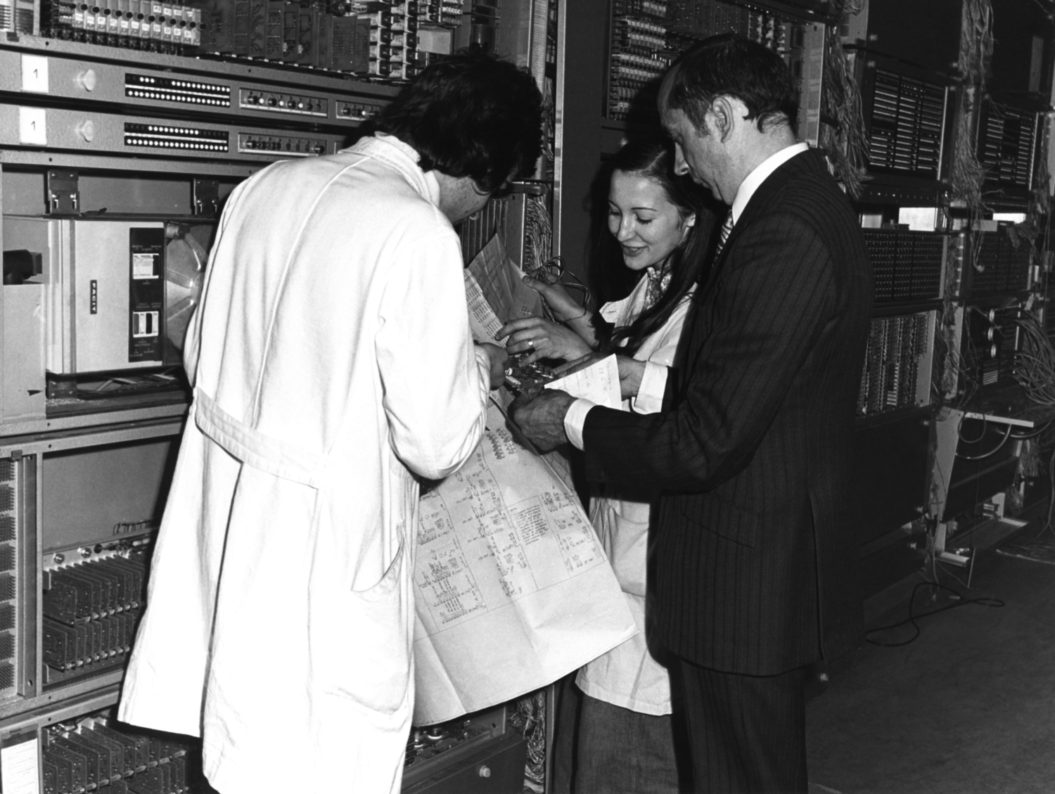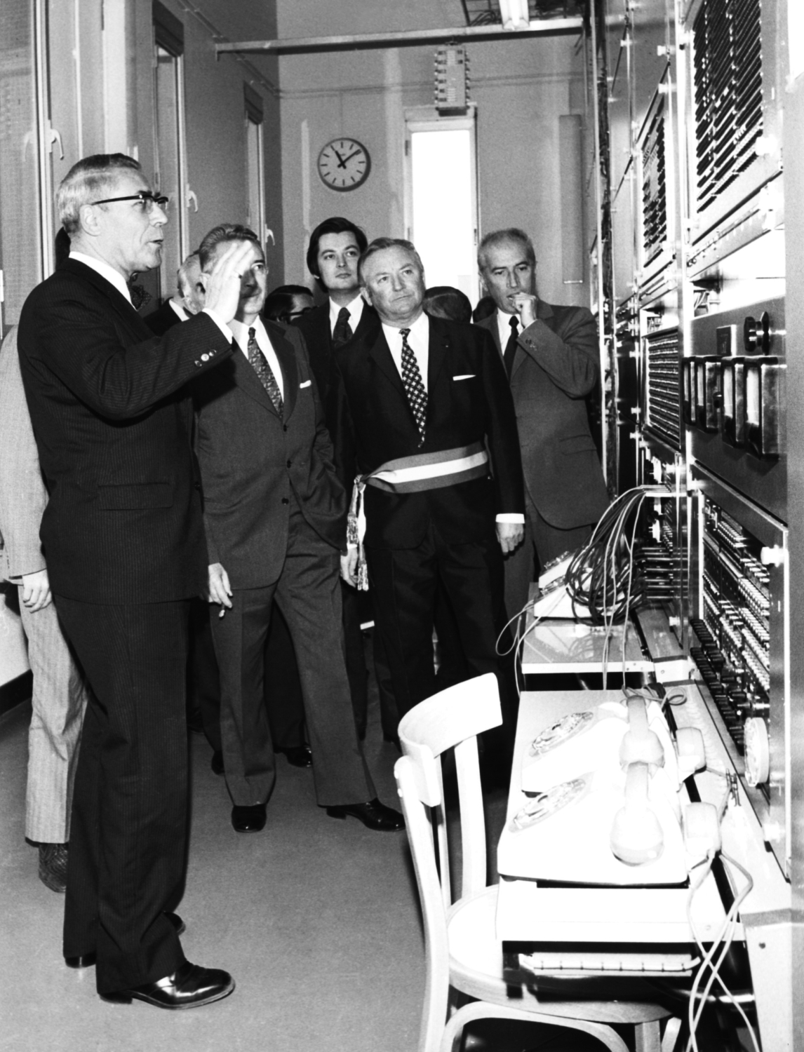 Ci-dessus : inauguration officielle le 12 octobre 1973 du Commutateur PENTACONTA 2080TIT Le Plessis-Bouchard A1 (NE11) par M. le Directeur Régional des Télécommunications de Paris Extra-Muros – Guy Cornet-Vernet (à gauche, complet noir, 1er plan)