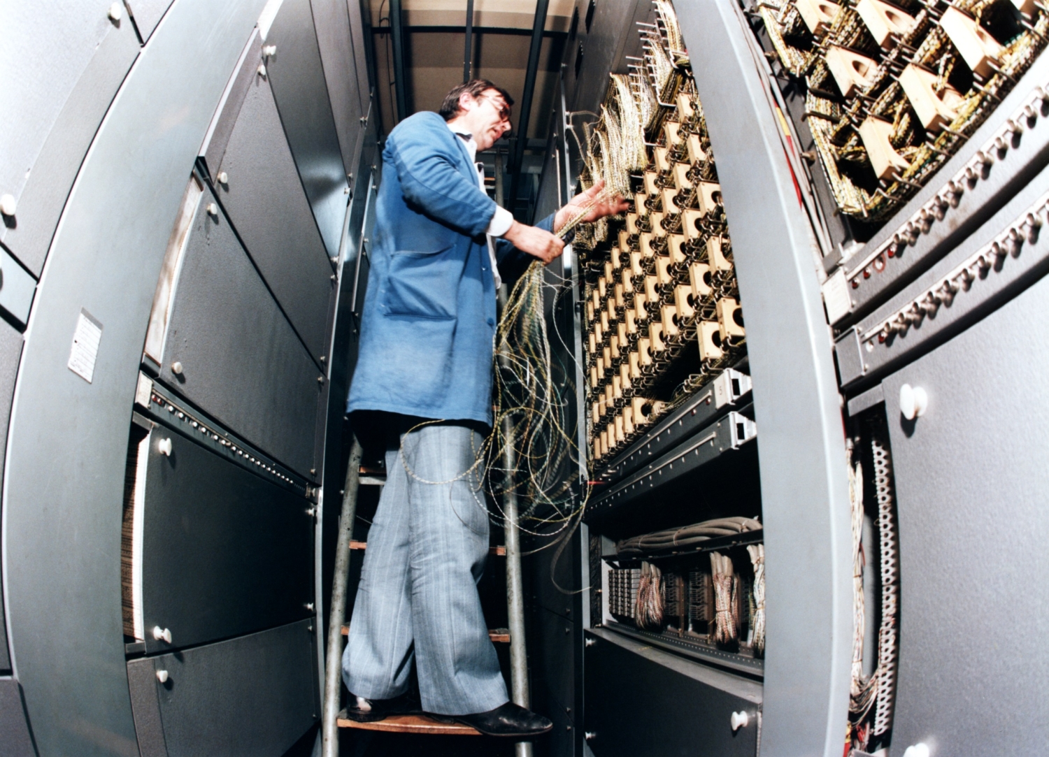 Ci-dessus : technicien des télécommunications câblant de nouvelles routes dans le Traducteur Impulsionnel à Tores (TIT) du Commutateur PENTACONTA 2080 de Brune 1 PC1 (AB42).