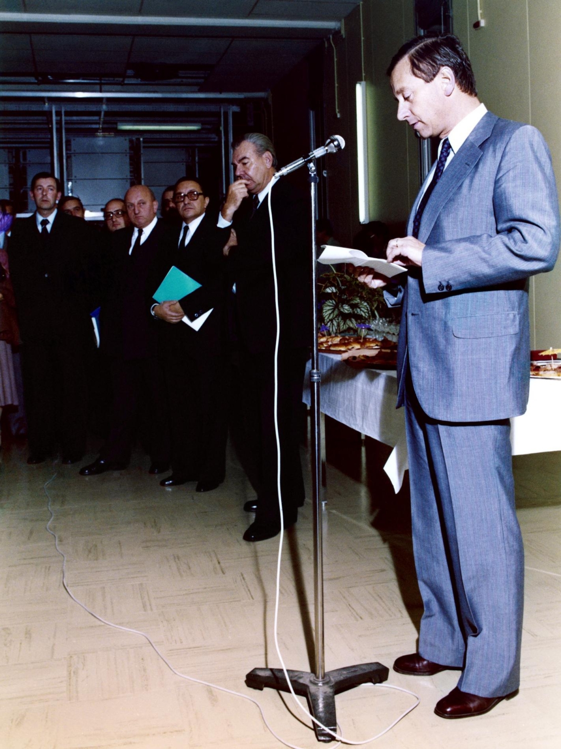 - À droite, M. Roger Légaré, en complet gris, main à la bouche, prochain successeur de M. Guy Cornet-Vernet le 8 novembre 1973.
