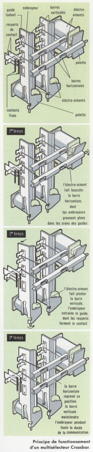 Ces Commutateurs adoptent la nouvelle technologie de matrices de contacts à barres croisées (crossbar) consistant en des mouvements de faible amplitude de deux jeux de barres rectangulaires, chaque jeu étant croisé l’un par rapport à l’autre à angle droit, et chaque barre étant commandée par un relais.