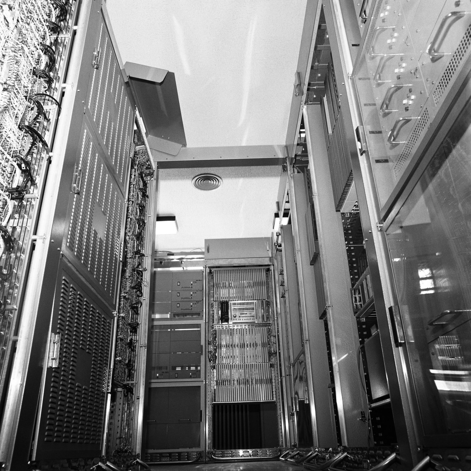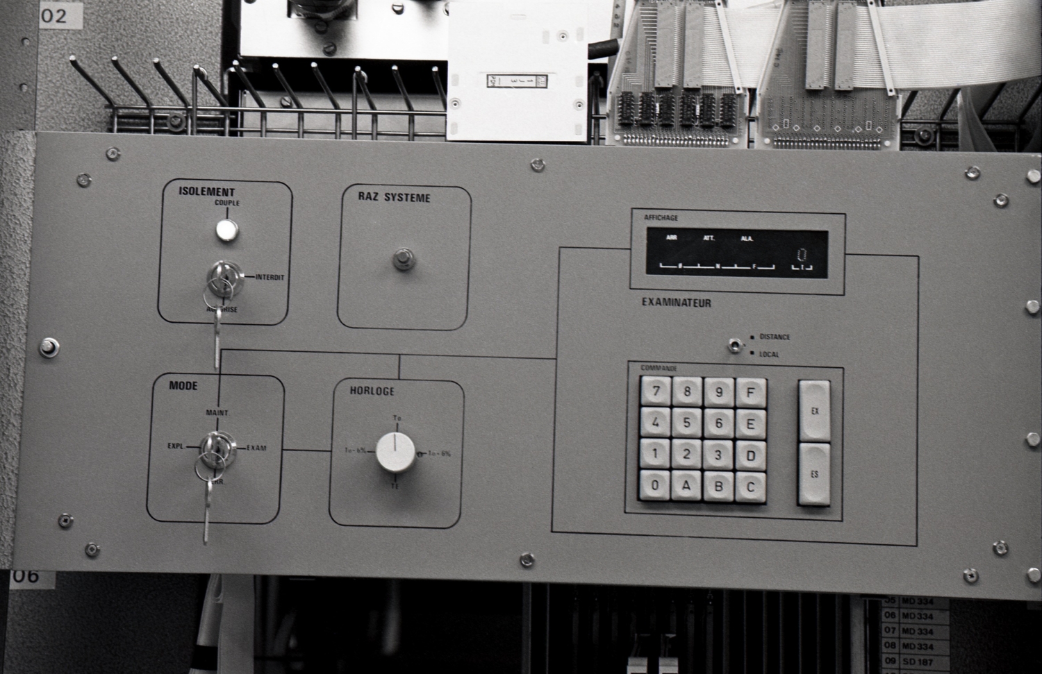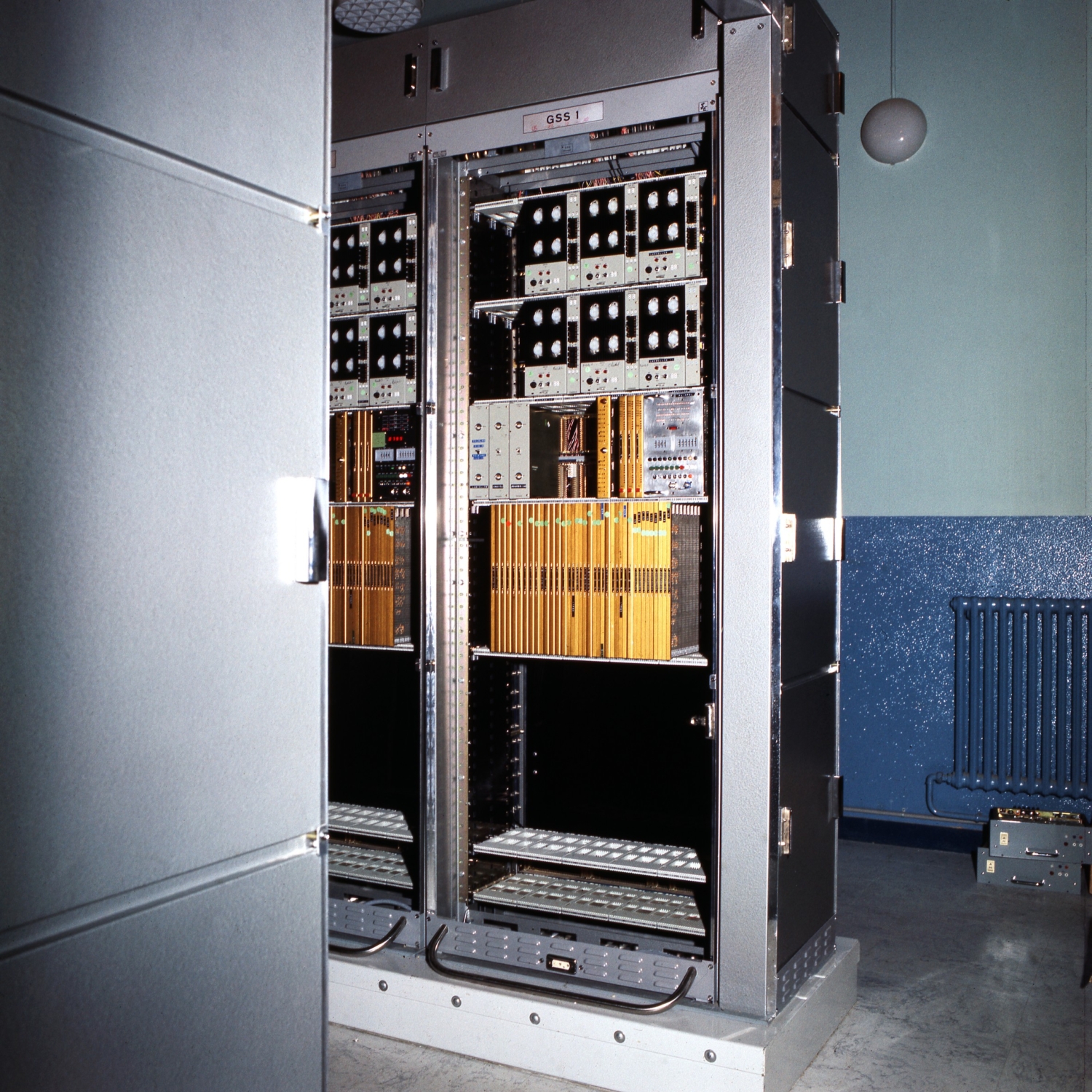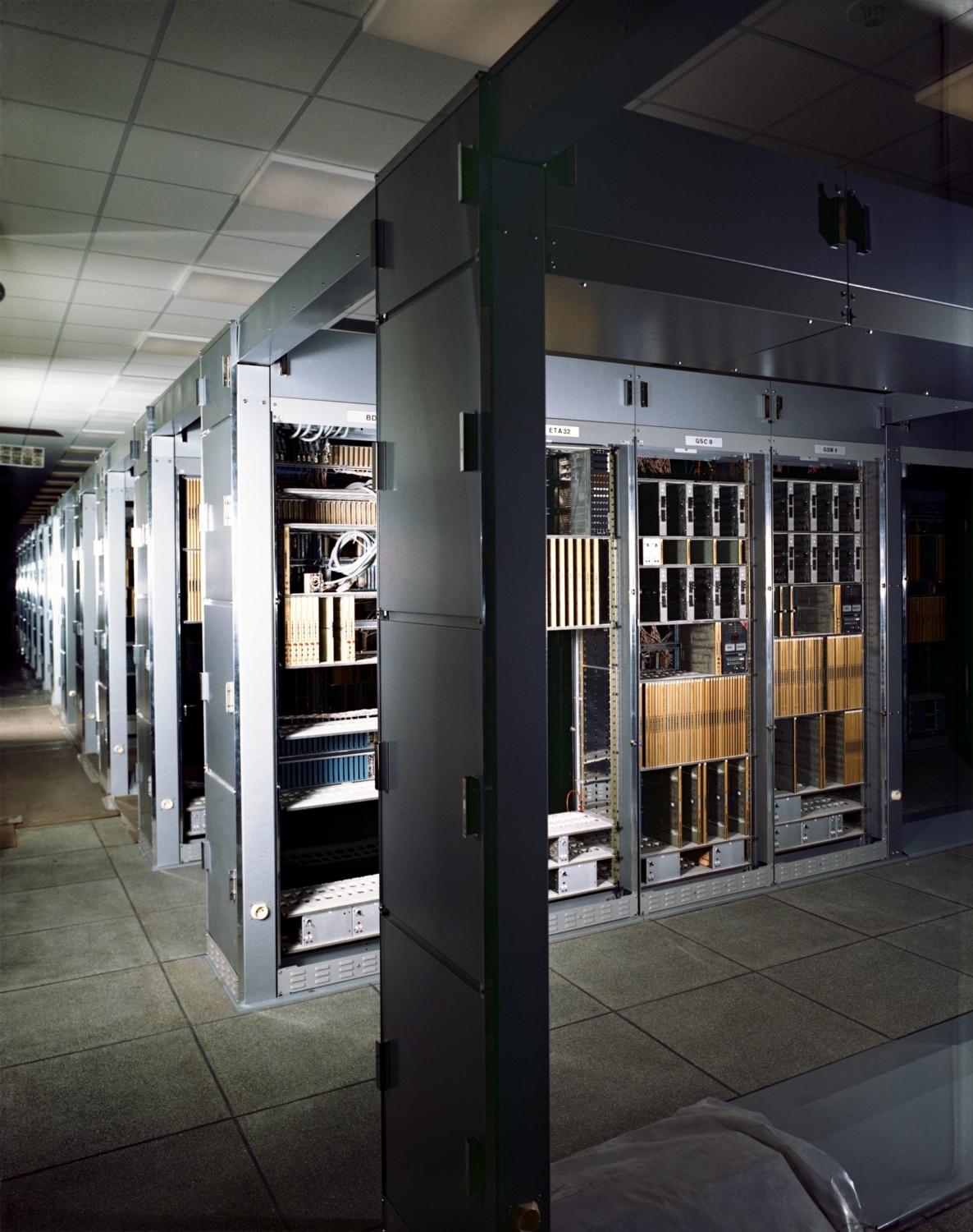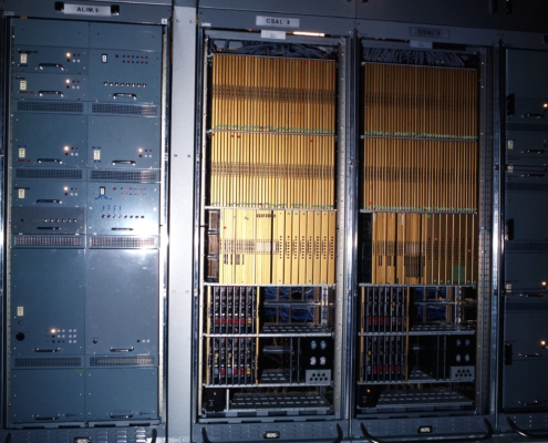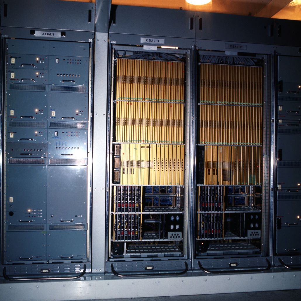 • Sont visibles, caches retirés, les 2 Unités de Commande Dupliquées (UCD) basées sur le modèle de calculateur CS40, leurs 2×4=8 Dérouleurs de Bandes Magnétiques (DBM).