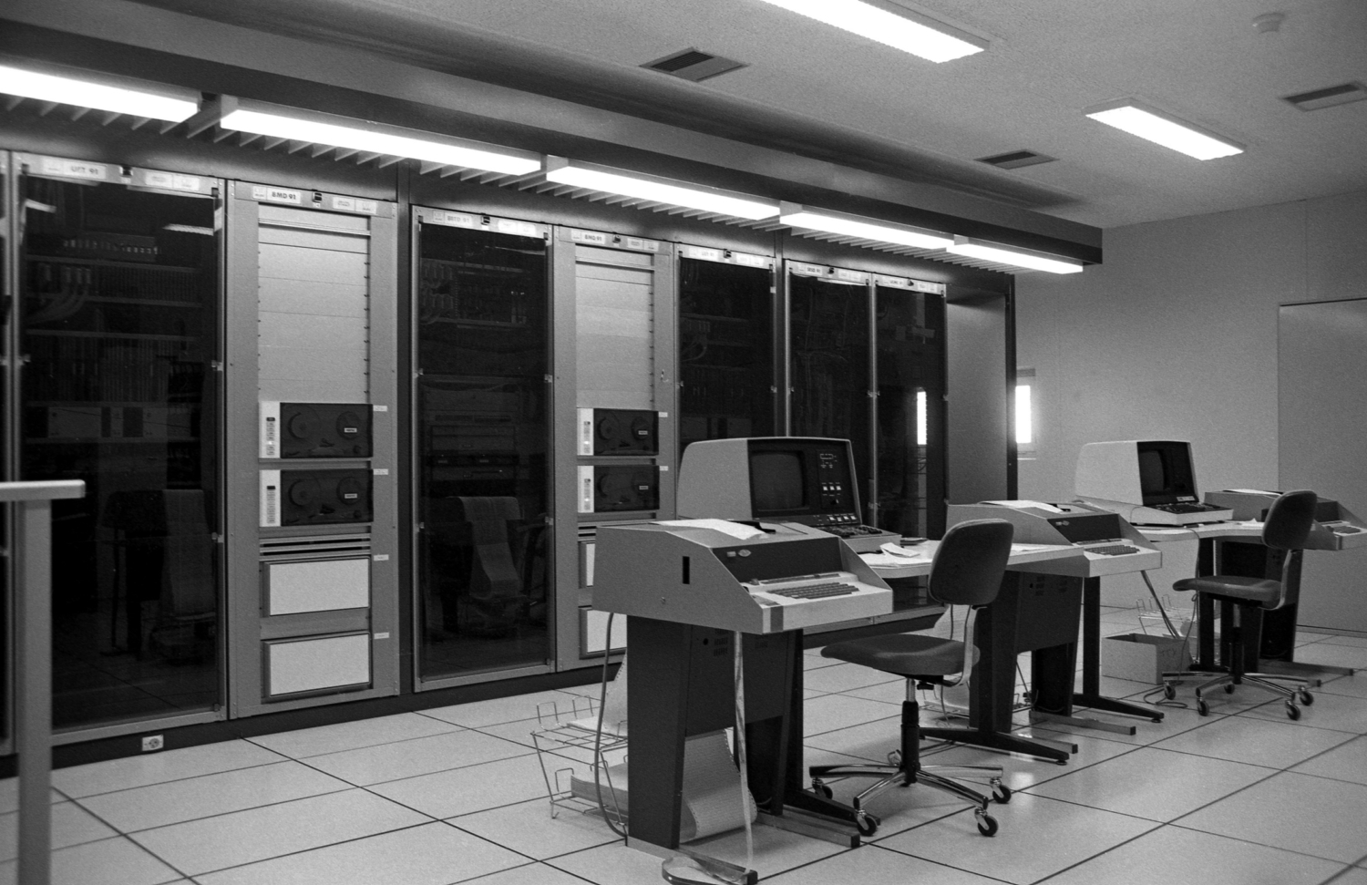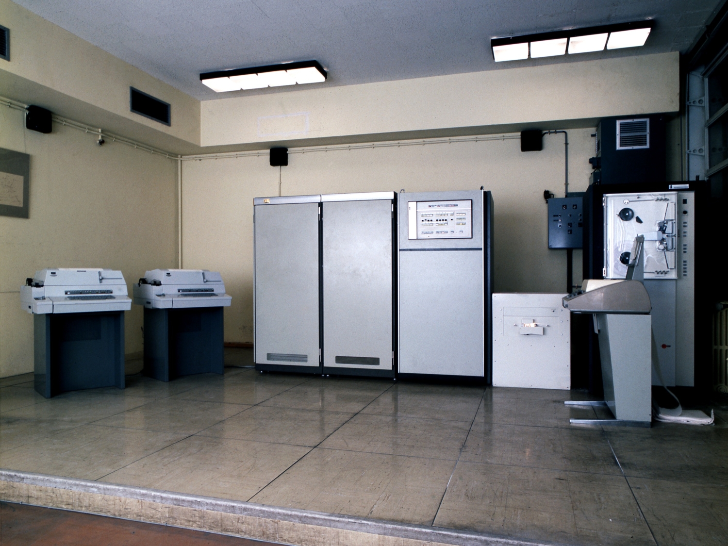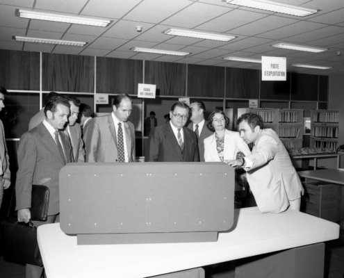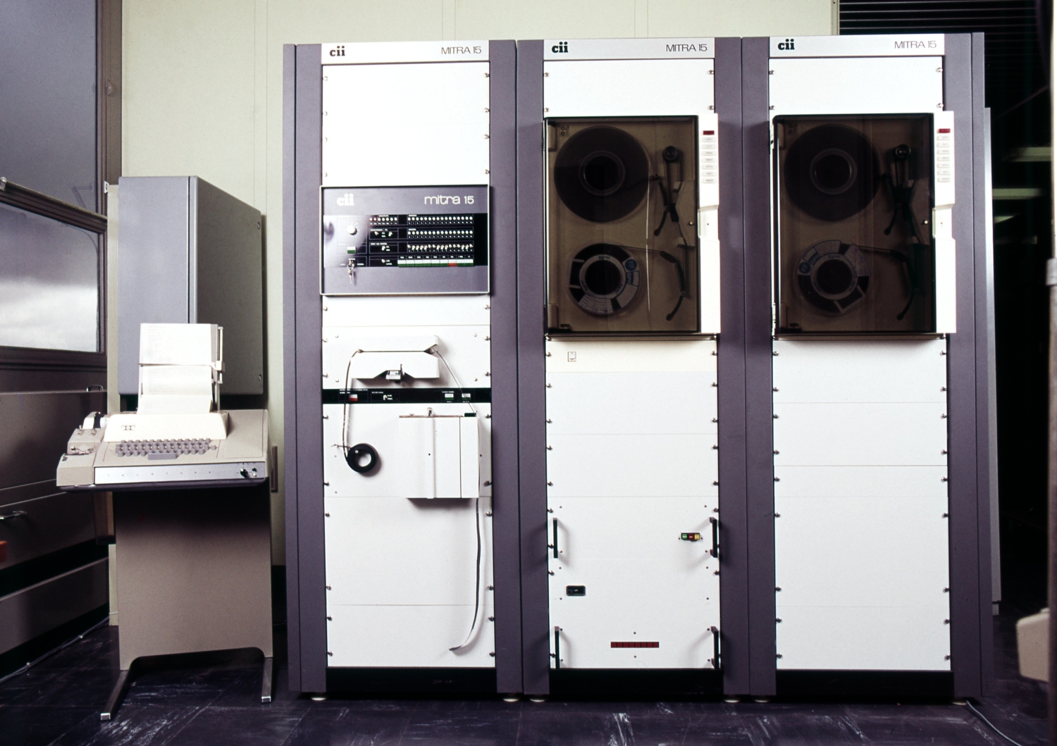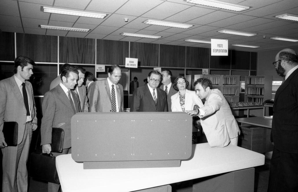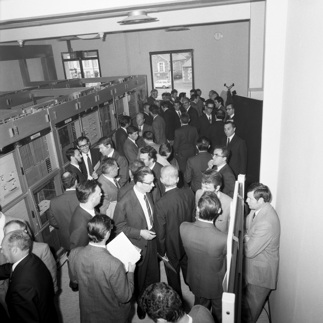 • Au fond, le Centre de Traitement des Informations (CTI), modèle CII 10010 associé au Commutateur E10CTI de Saint-Brieuc, avec à sa droite son Dérouleur de Bandes Magnétiques (DBM).