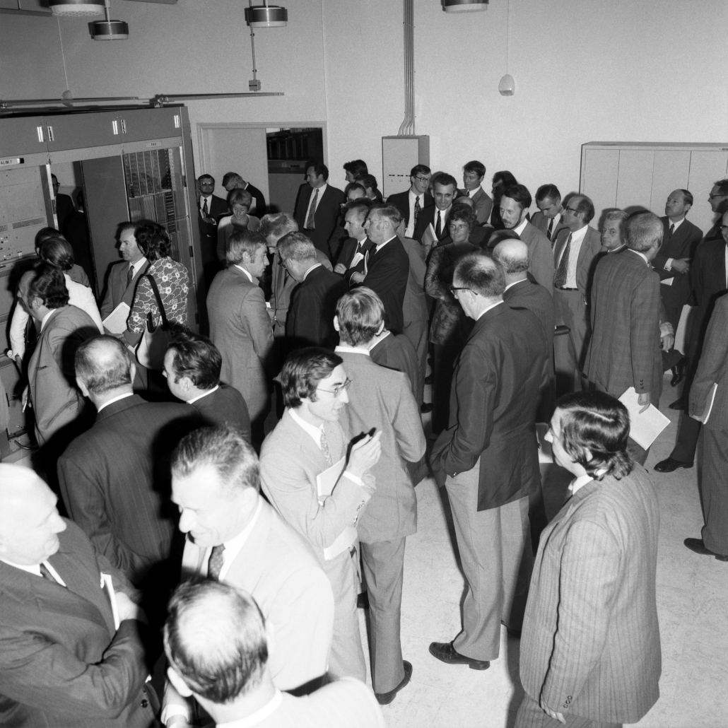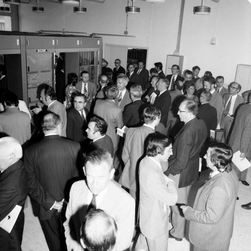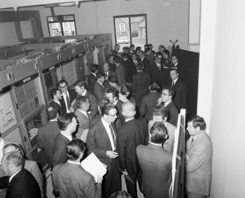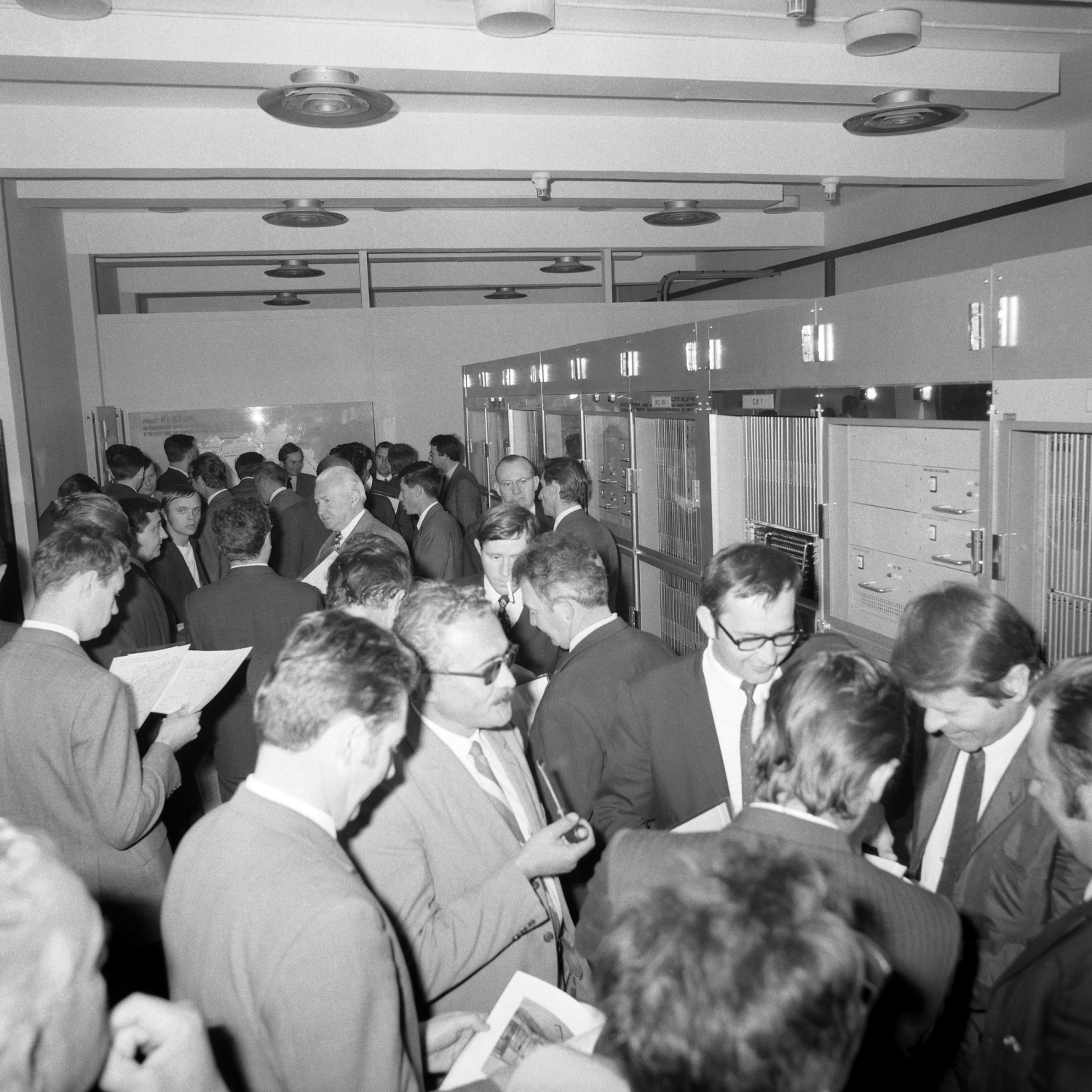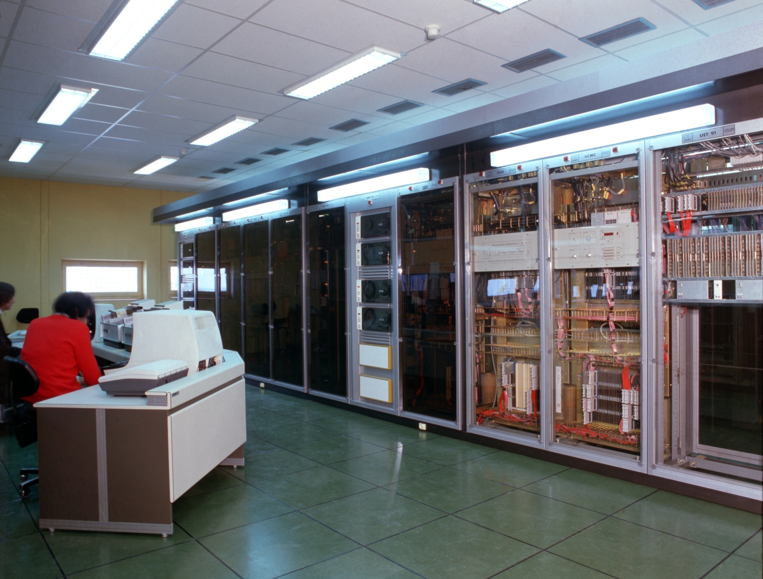 • Au fond, le Centre de Traitement des Informations (CTI), modèle CII 10010 associé au Commutateur E10CTI de Saint-Brieuc, avec à sa droite son Dérouleur de Bandes Magnétiques (DBM).