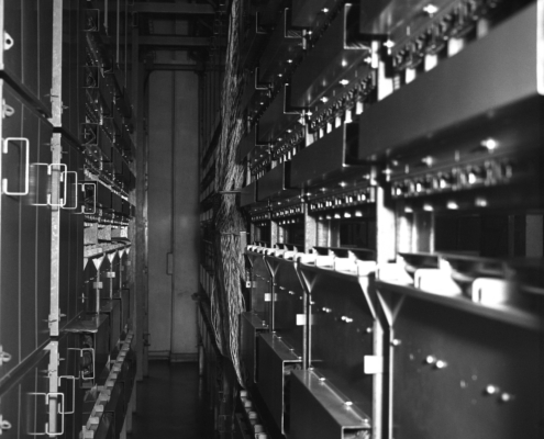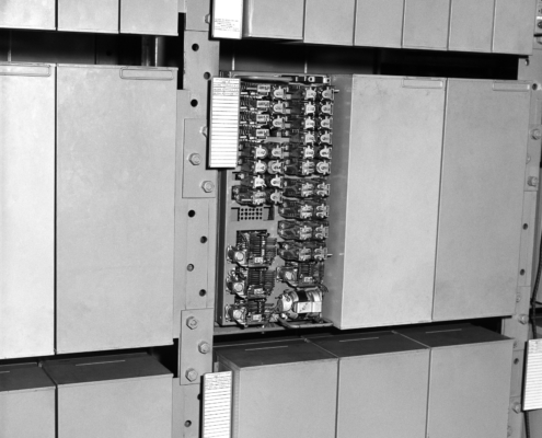 Ci-dessus : Travée d’Enregistreurs-Traducteurs interurbains et leurs circuits associés du Commutateur R6N1 Rouen – Jeanne d’Arc 1.