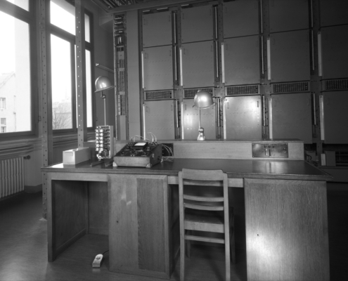 - cliché 3 : Tables d’Essais et Mesures des Lignes Téléphoniques connectées aux abonnés (Service Technique des Abonnés). À noter l’utilisation de Cadrans Téléphoniques spéciaux à 11 trous, qui servaient à vérifier la bonne rotation complète des Chercheurs R6 de l’étage d’entrée du Commutateur.