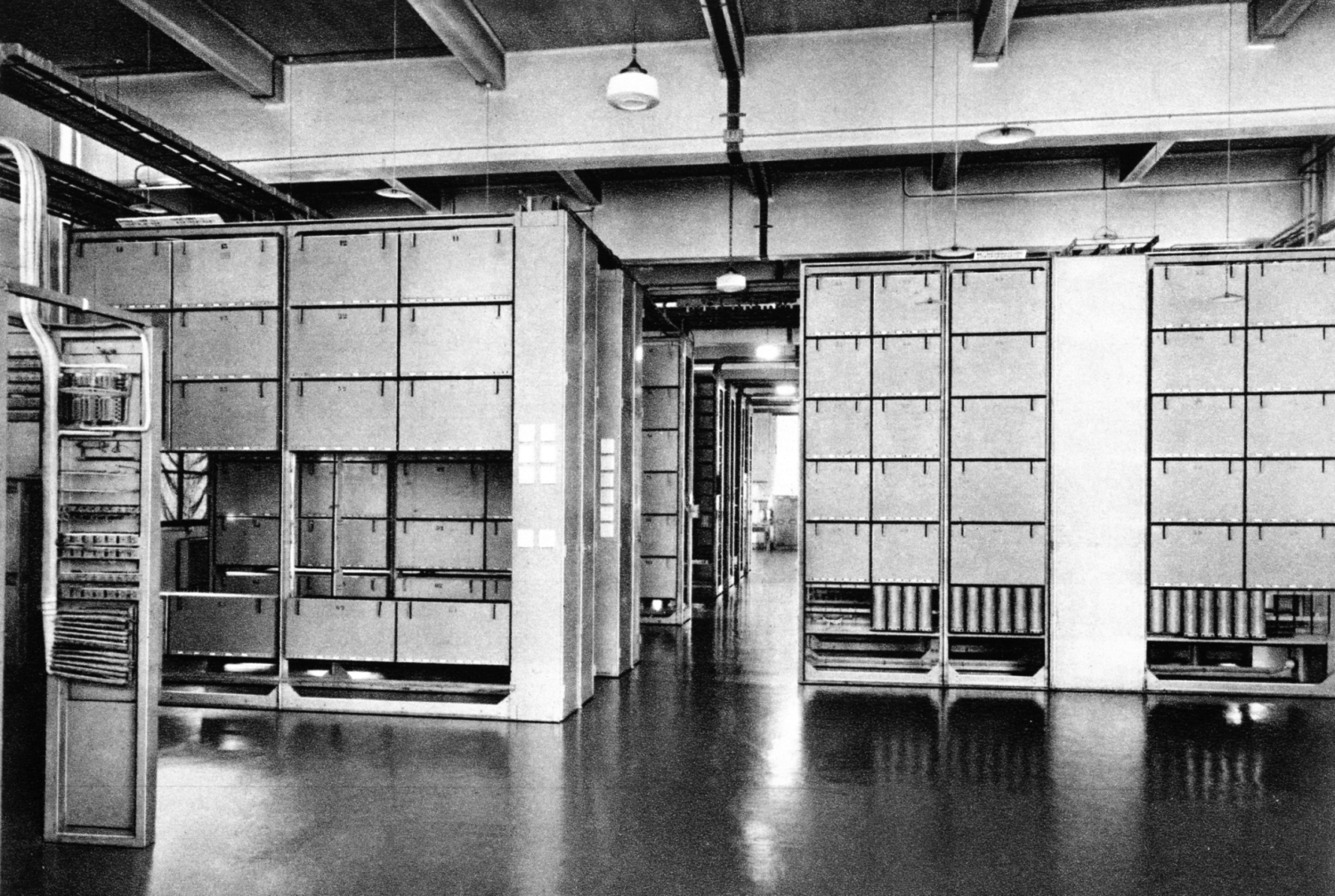 - cliché 12 : travée des circuits Enregistreurs et Taxeurs Interurbain, côté précâblage.