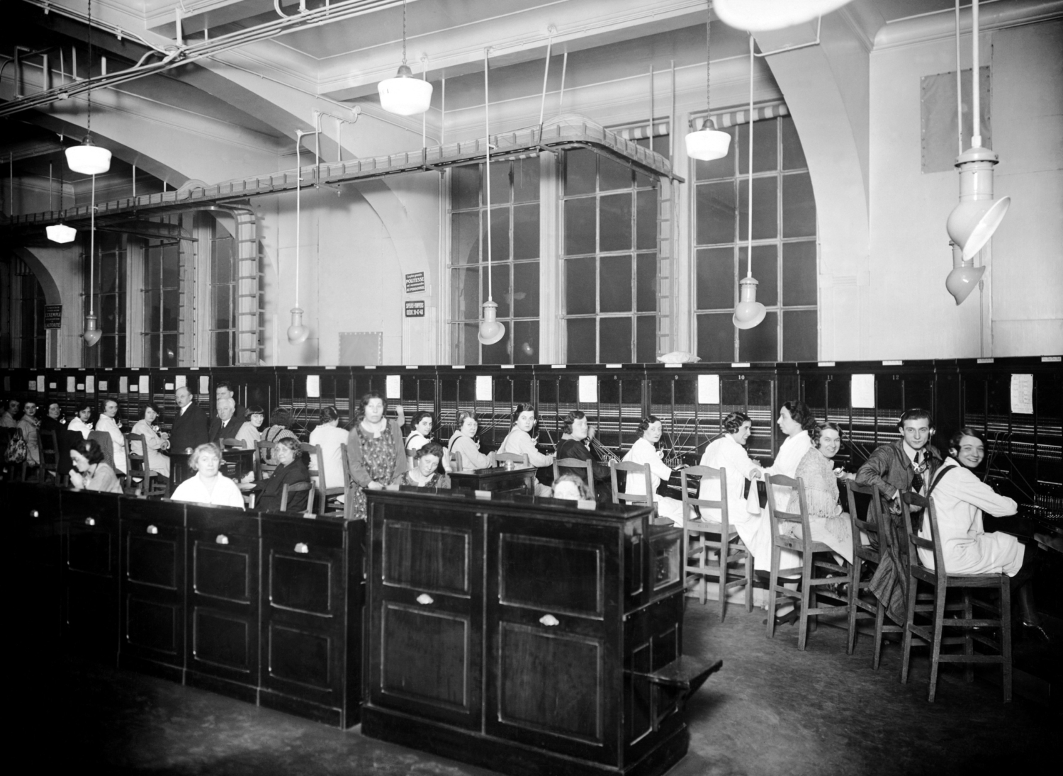 Ci-dessus : Techniciennes en position d’observation grâce aux Tables d’Essais et Mesures du Commutateur ROTARY 7A à Chercheurs – PRINCESSE (Le Vésinet).