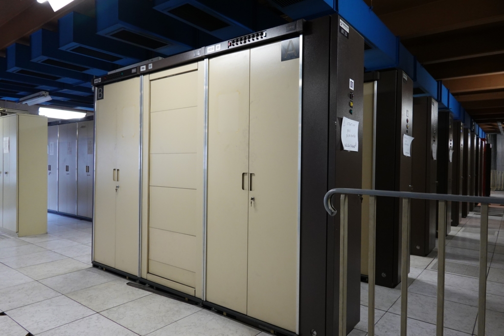 - À droite, les baies de Compteurs de Taxes, qui dans ce prototype, sont enceints dans des cadres métalliques anti-poussière, préfigurant la structure modulaire qui sera adoptée dans le futur système ROTARY 7B1.