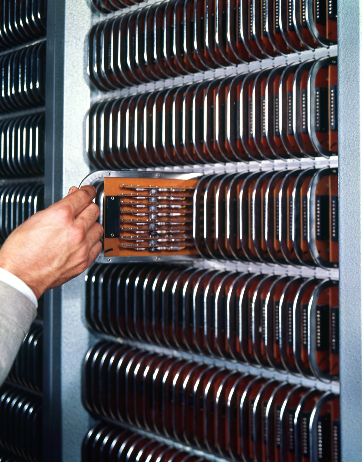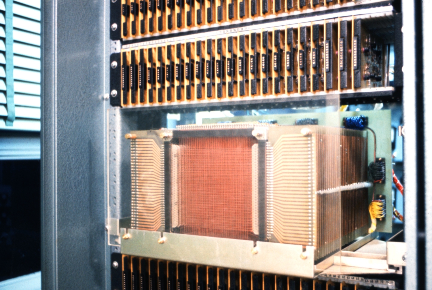 Ci-dessus : vue partielle de la baie de gauche de la 1ère travée. Il s’agit d’une Mémoire Vive à Tores de Ferrite, d’accès rapide.