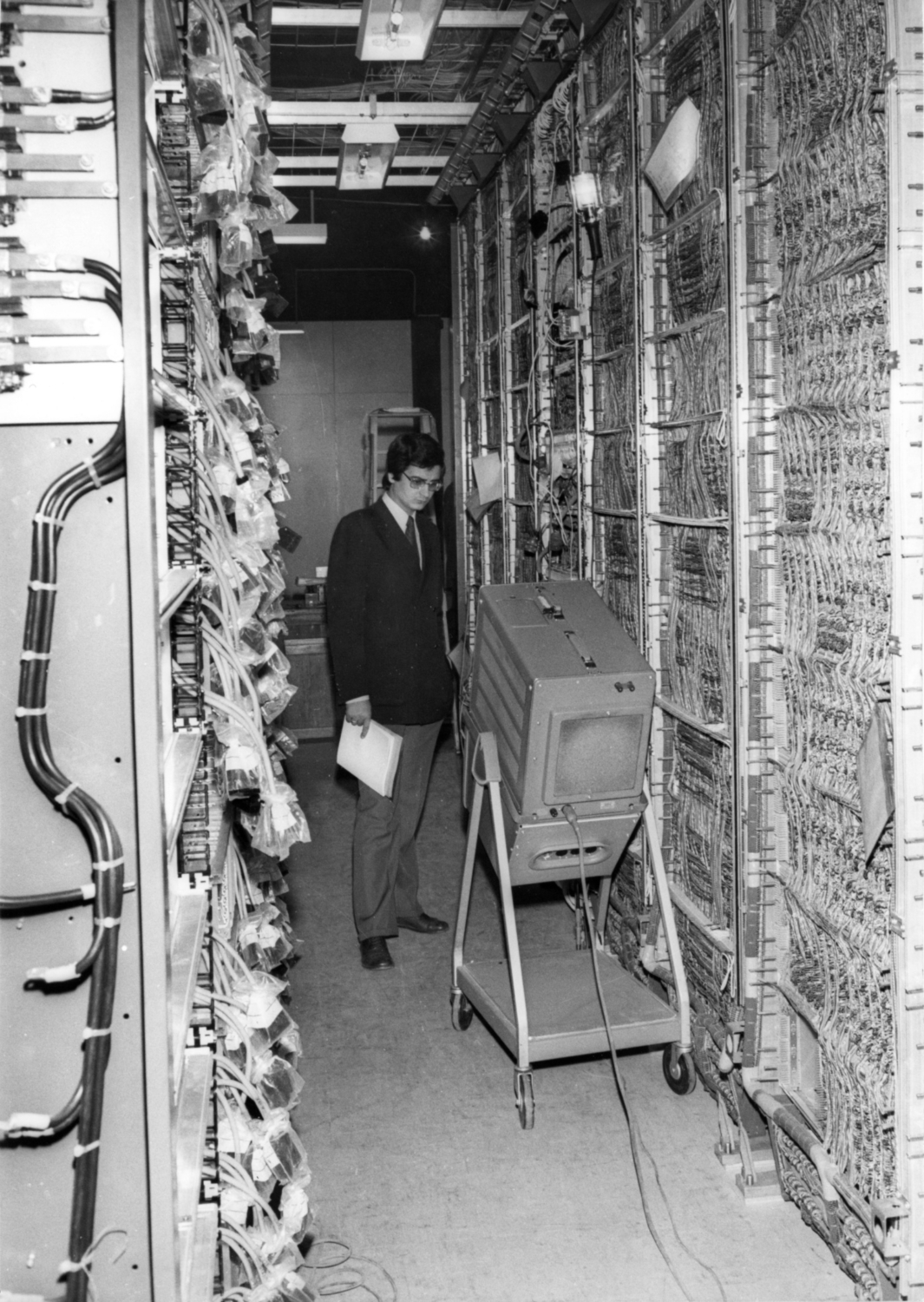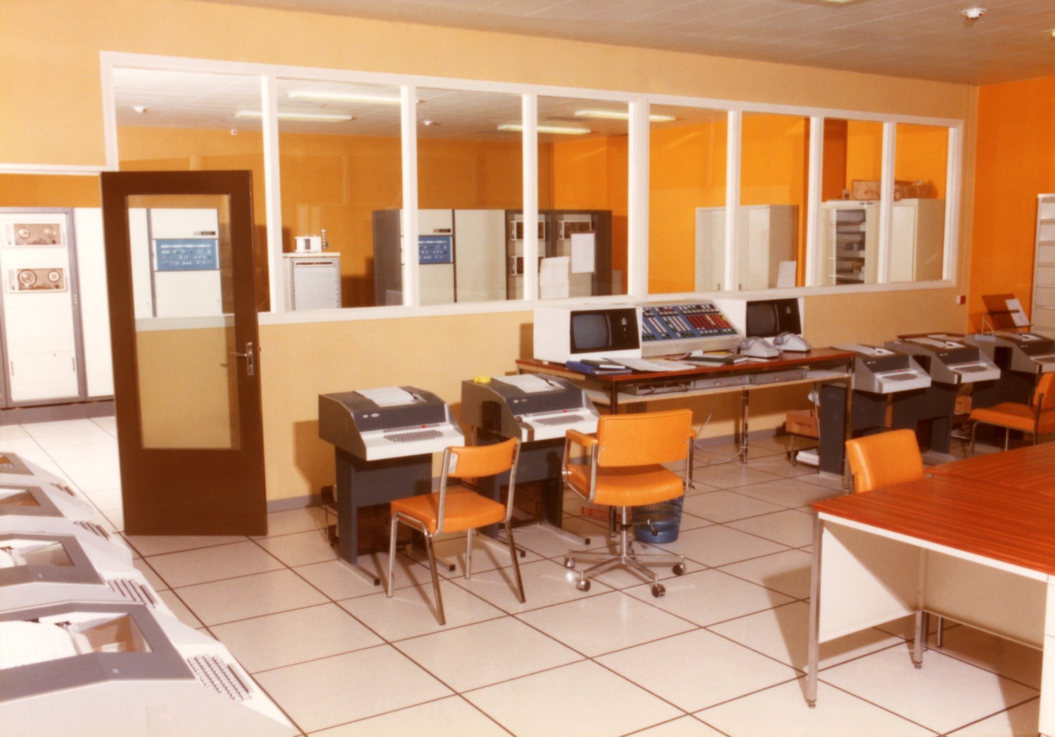 Ci-dessus : vue à partir de la salle de supervision du Commutateur AXE Spatial Soisy-sous-Montmorency B1 (NE32) alors en construction.