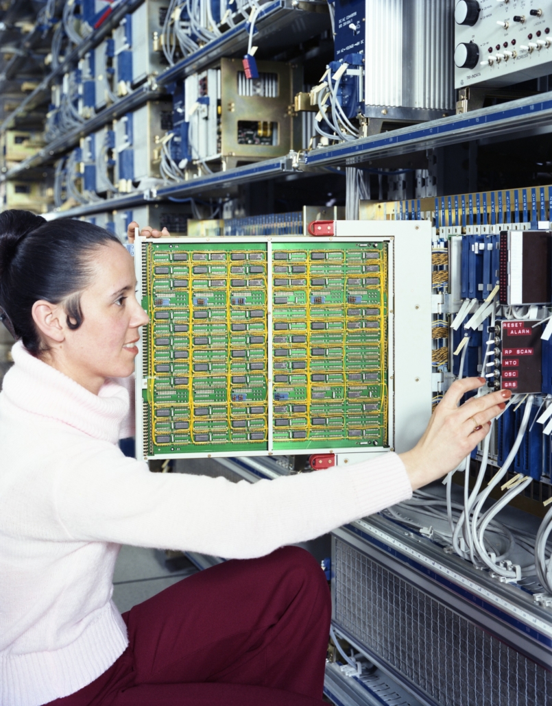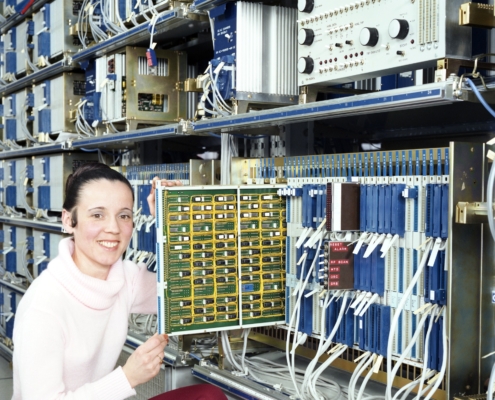 Ci-dessus : Technicienne montrant des cartes d’un des Calculateurs du Commutateur AXE Spatial Orléans Grenier-à-Sel (OR10).