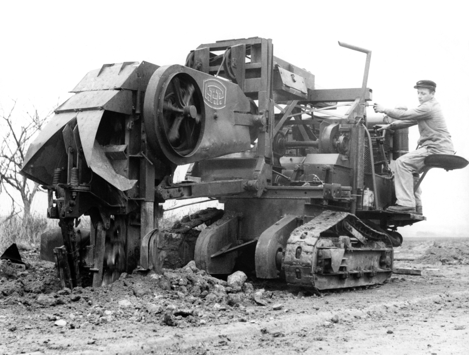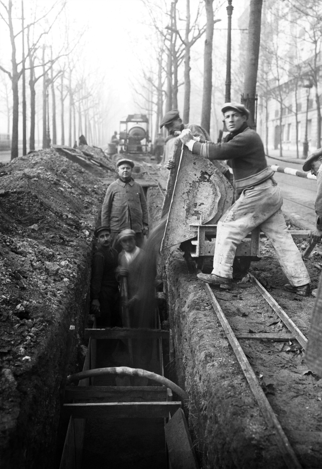 Ci-dessus : pose d’un câble téléphonique à enveloppe de plomb, place du châtelet à Paris, en 1929 ou 1930.