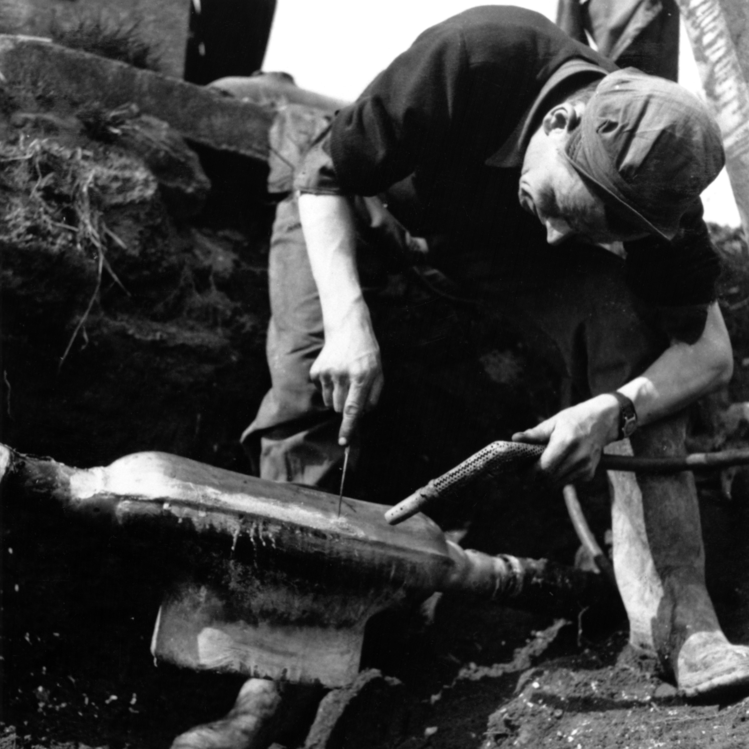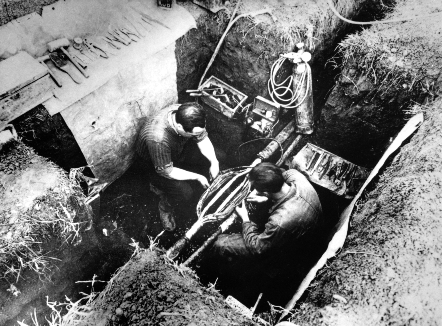Ci-dessus : équipe du Service des Lignes de Paris et sa banlieue, en cours de pose de câbles téléphoniques multipaires de cuivre à enveloppe de plomb dans une tranchée à ciel ouvert.