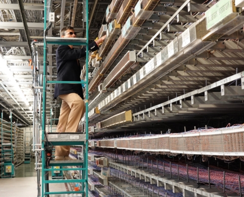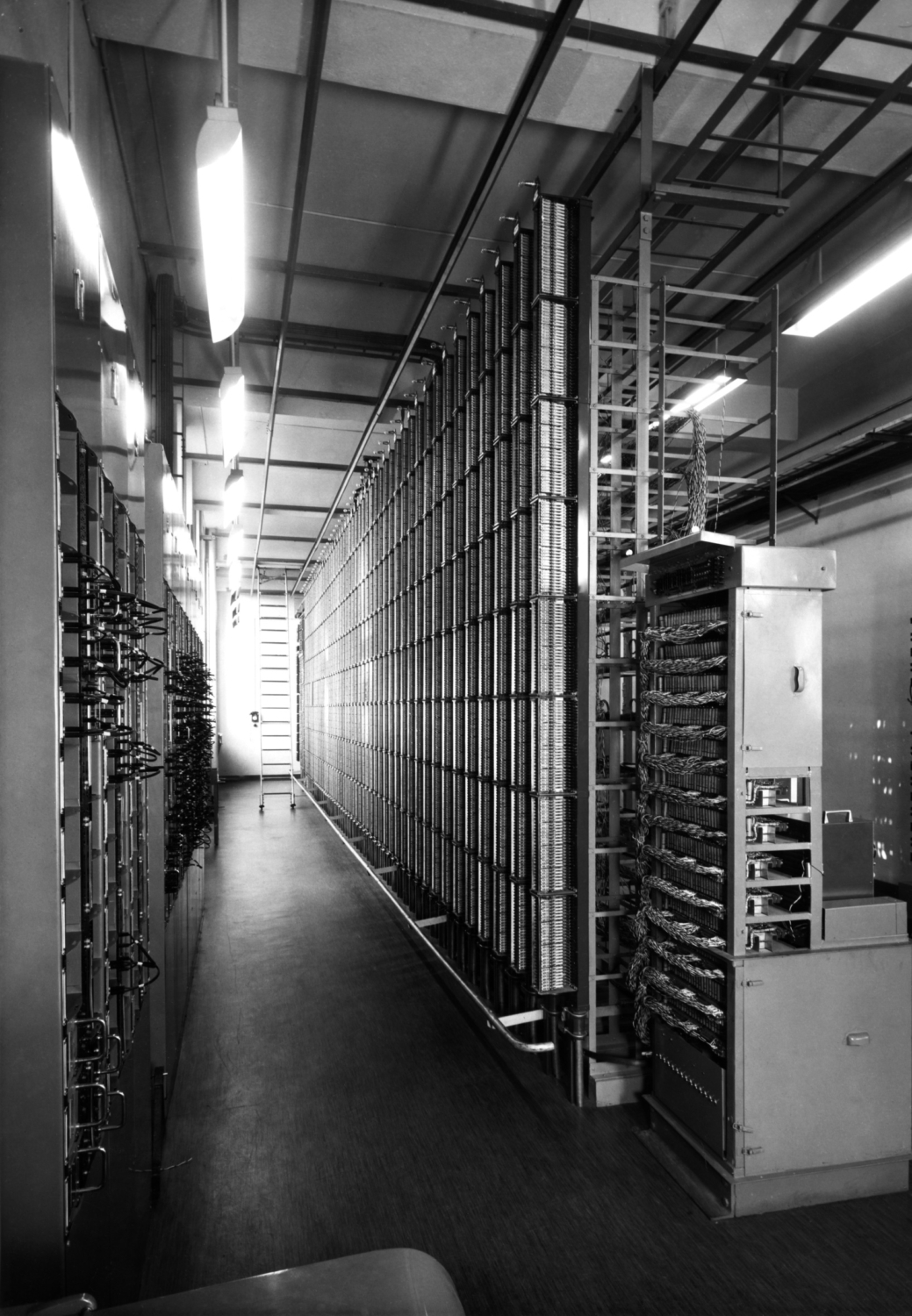 Ci-dessus : vue des Têtes Verticales du Répartiteur d’Orléans Grenier-à-Sel, où chaque abonné possède sa position d’arrivée (Transport) dans le Centre Téléphonique.