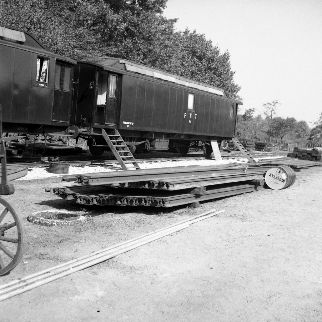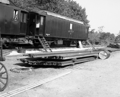 - Au sortir de la seconde guerre mondiale, le matériel roulant est remplacé par un ancien train-postal recyclé par l’équipe du train-parc. En effet, ce sont ces mêmes agents qui aménageront eux-mêmes leur train-parc en y apportant tout le confort moderne.