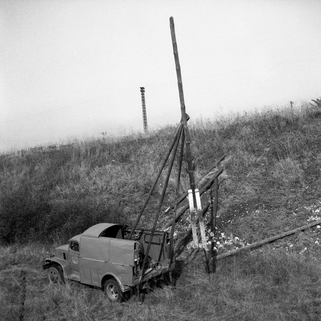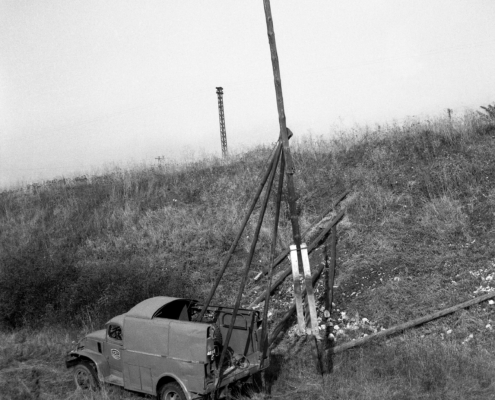- cliché 4 : l’on constate la présence d’un camion-treuil des PTT équipé d’une chèvre articulée, d’un modèle de marque Chevrolet, modèle K43 provenant des U.S.A qui nous a été fourni en quantité dès la fin de la guerre en 1945 afin de pouvoir rétablir au plus vite l’intégrité du réseau téléphonique des lignes aériennes.