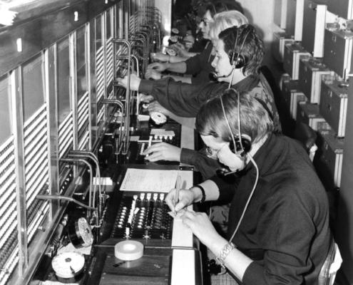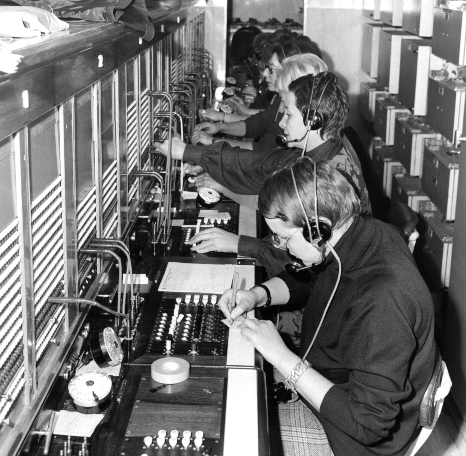 Ci-dessus : aménagement d’un multiple téléphonique (dans une pièce exiguë) avec opératrices PTT chargées de recevoir et d’établir les communications avec les zones manuelles ou semi-automatiques, notamment les communications internationales (encore largement manuelles en 1970).