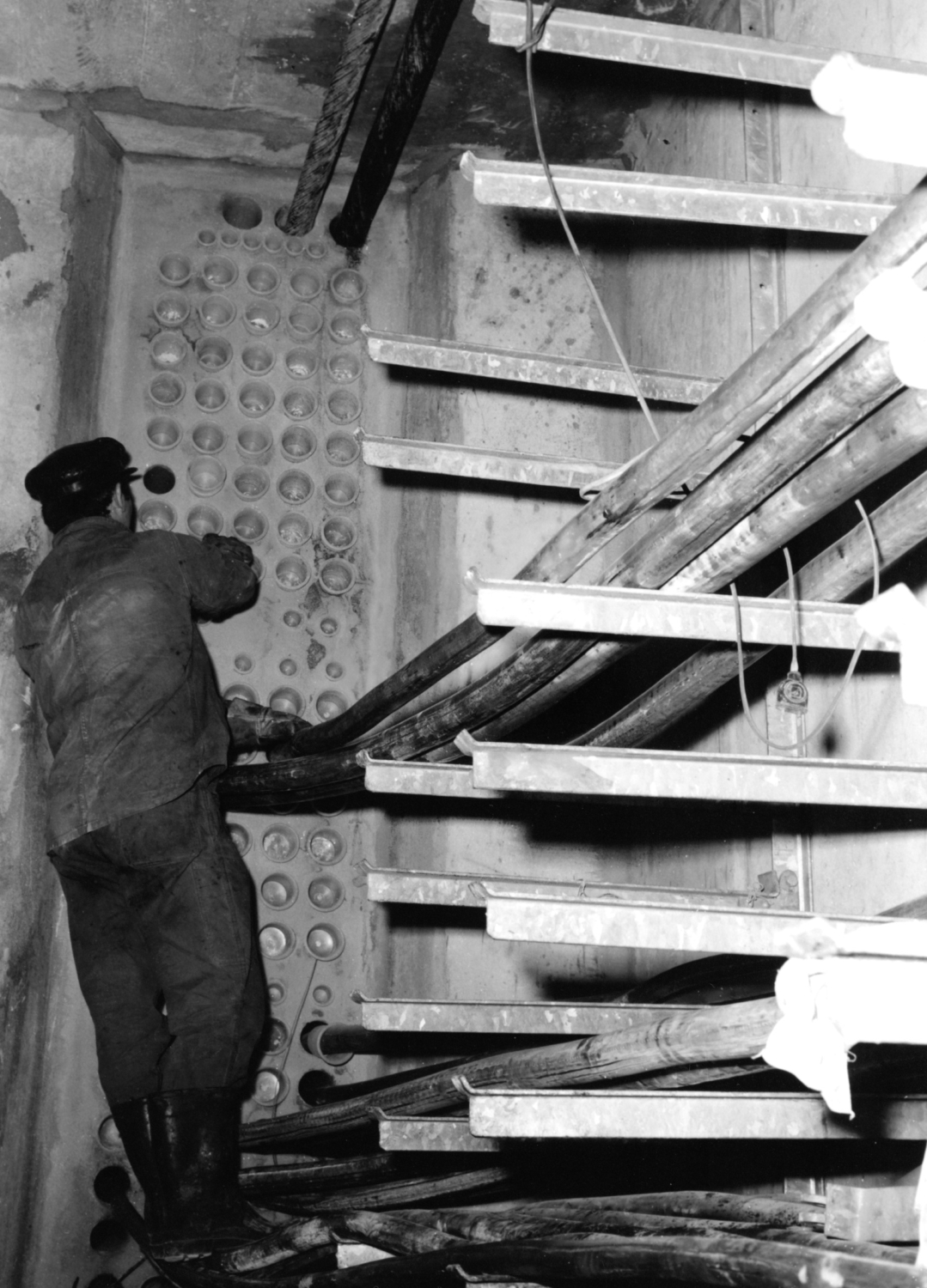 - Les câbles isolés au plomb sont disposés le long de la galerie, de chaque côté, et reposent sur des consoles horizontales construites à cet effet.