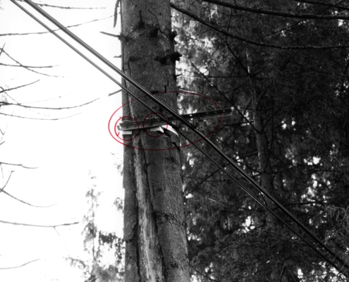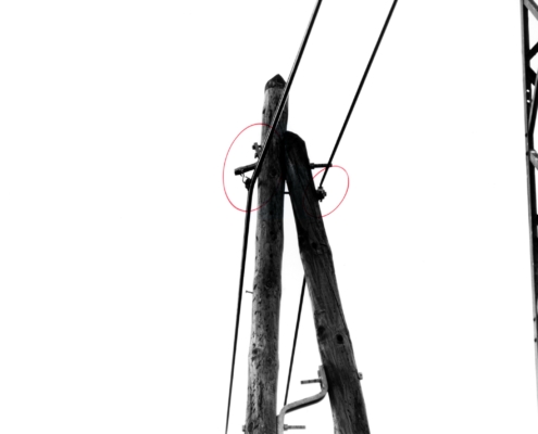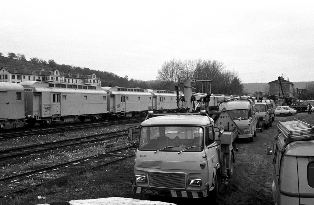 Ci-dessus : le Train-Parc de seconde génération (ex train-postal) et son équipe d’Agents des Lignes, en cours d’intervention à Valence (26), pour reposer des poteaux et des lignes téléphoniques suite à une probable tempête.