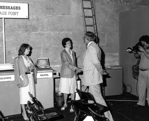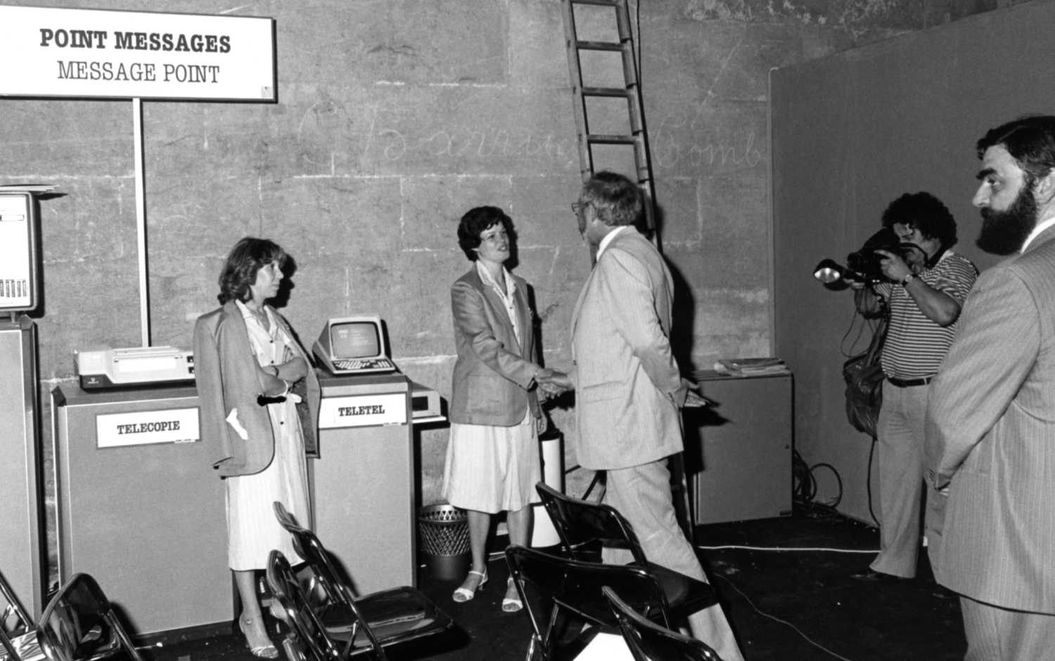 - N°2 : M. le Ministre des PTT – Louis Mexandeau salue les agents PTT qui tiennent le Point Messages (Fax et Minitel : équipements dernier cri), installé dans l’Orangerie.