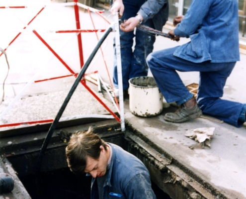 Ci-dessus : conditions de travail très pénibles pour une équipe d’agents des lignes opérant sur câbles téléphoniques de plomb avec lampe à souder à l’acétylène, dans les égouts de Paris, sous la rue des Saints-Pères.