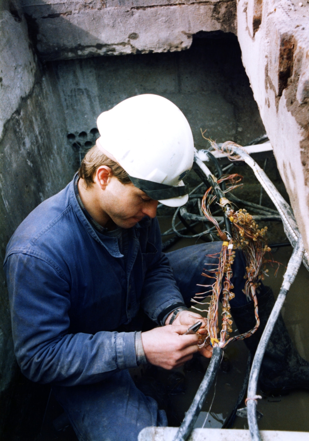 Ci-dessus : deux Agents de la subdivision des lignes de Paris procédant, en sous-sol, à l’épissure de deux tronçons de câble téléphonique multipaires à gaine PVC.