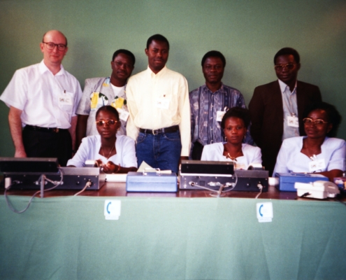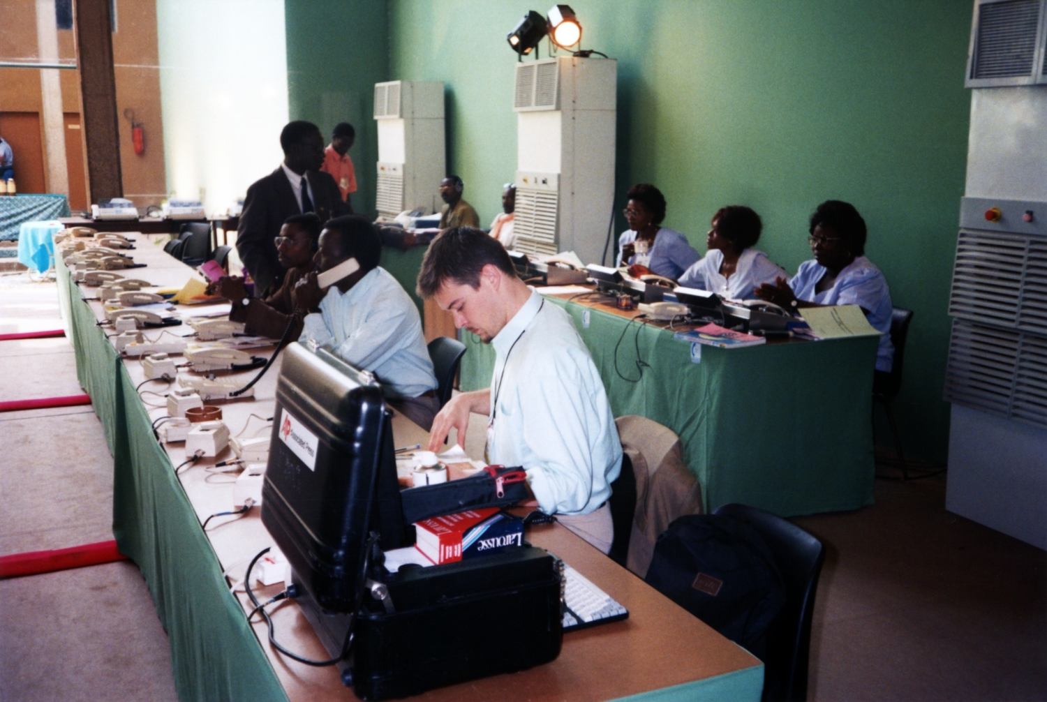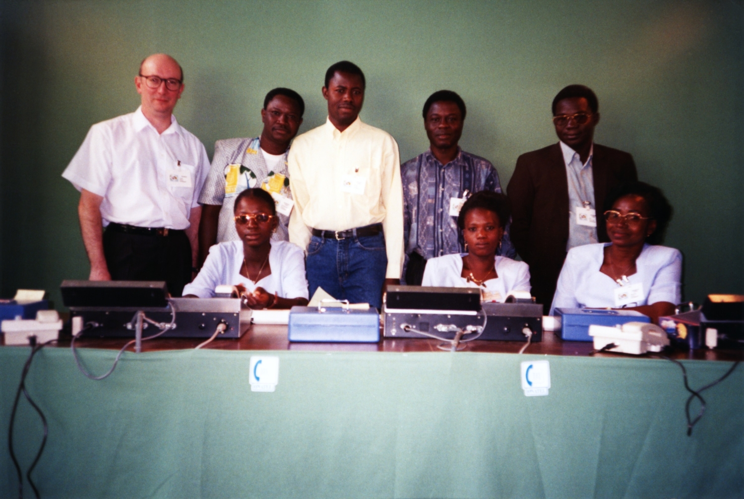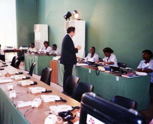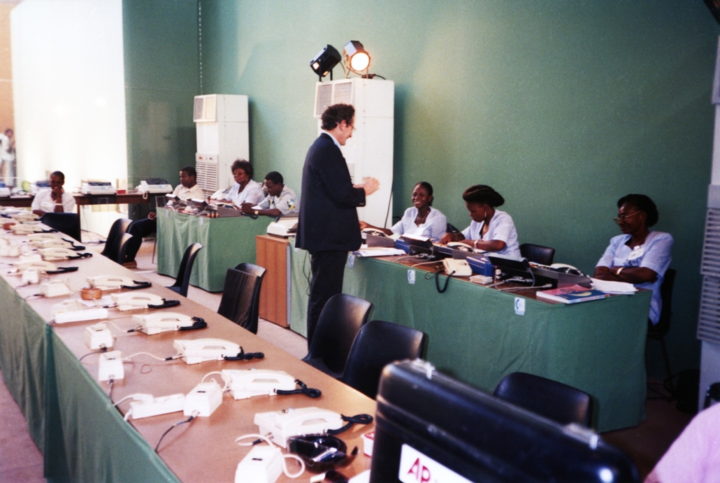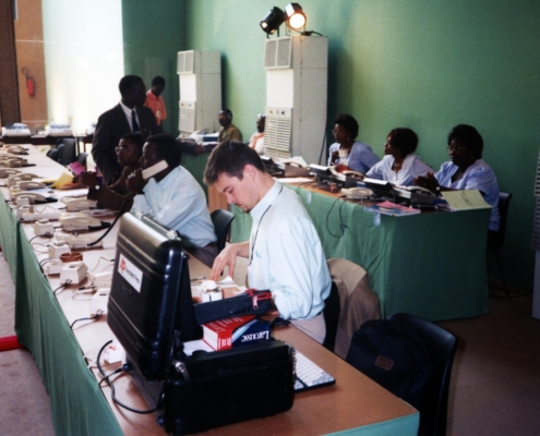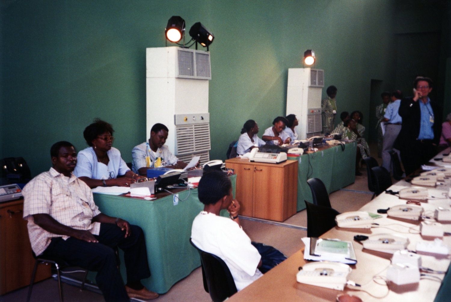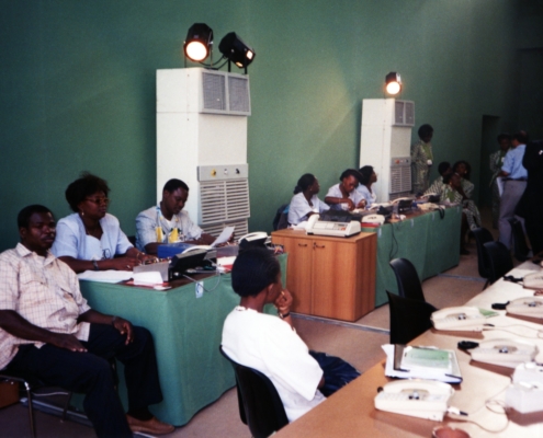 Ci-dessus : la Salle de Presse montée en coopération entre l’ONATEL (Office National des Télécommunications du Burkina-Faso) et France-Télécom (service Bureau Temporaire) mettant à disposition des journalistes couvrant le Sommet France-Afrique les 5 et 6 décembre 1996 à Ouagadougou, les moyens de télécommunications nécessaires.