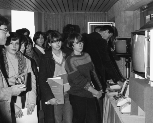 Ci-dessus : quelques vues de cette présentation Télétel, Annuaire Électronique et prototypes s’étant tenue en 1979 dans les locaux du CITAT à Issy-les-Moulineaux.