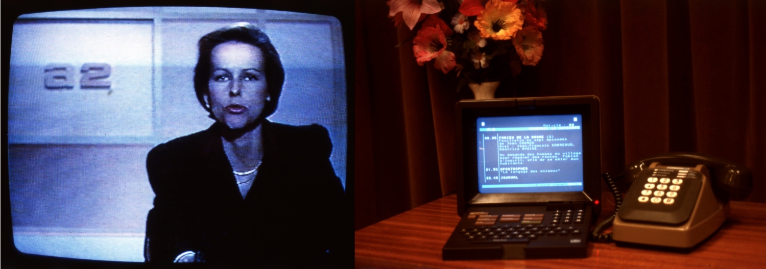 - Nous pouvons remarquer d’une part l’aspect très artisanal du boîtier Télétel placé sous le téléviseur de l’expérimentatrice, ainsi que le logo Télécommunications datant du septennat de M. le Président de la République – Valéry Giscard d’Estaing.