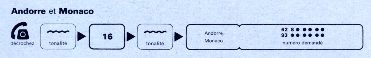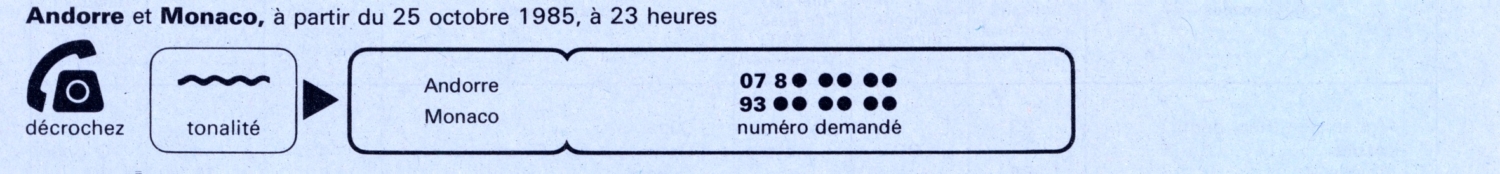 - Du 25 octobre 1985 à 23H00 au 2 mai 1986 les numéros de téléphones andorrans se conforment au plan de numérotage français à 8 chiffres : AB PQ MC DU dont l’ (AB = 07) reste attribué à la Principauté d’Andorre pour une durée transitoire de 6 mois.