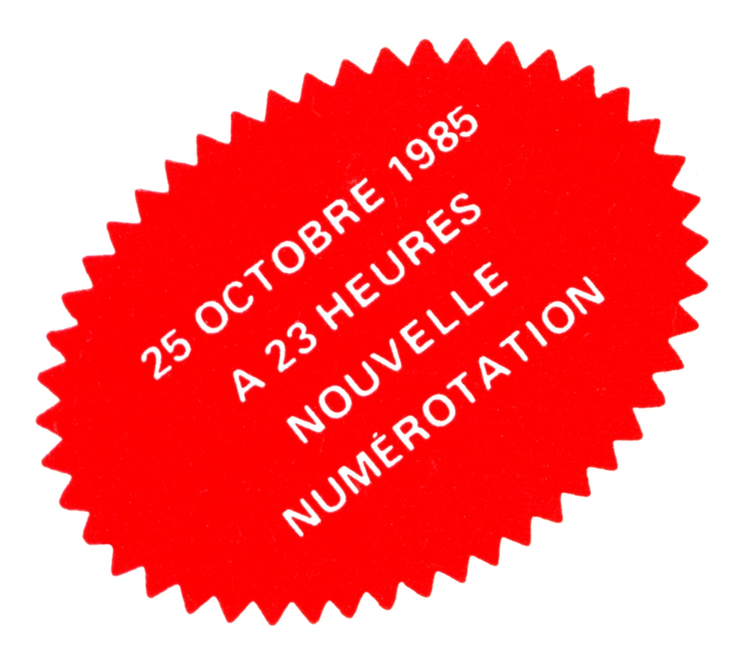 Le 25 octobre 1985 à 23H00, tout se simplifie. Ce moment marque le passage à la numérotation à 8 chiffres dans l’hexagone. (autocollant PTT)