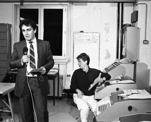 Ci-dessus : Plateau TV-Direct au Centre National de Coordination de Murat, pendant la soirée du passage à 8 chiffres, le 25 octobre 1985 juste à 23H05, dans l’attente des premières informations sur la réussite du basculage dans le pays.