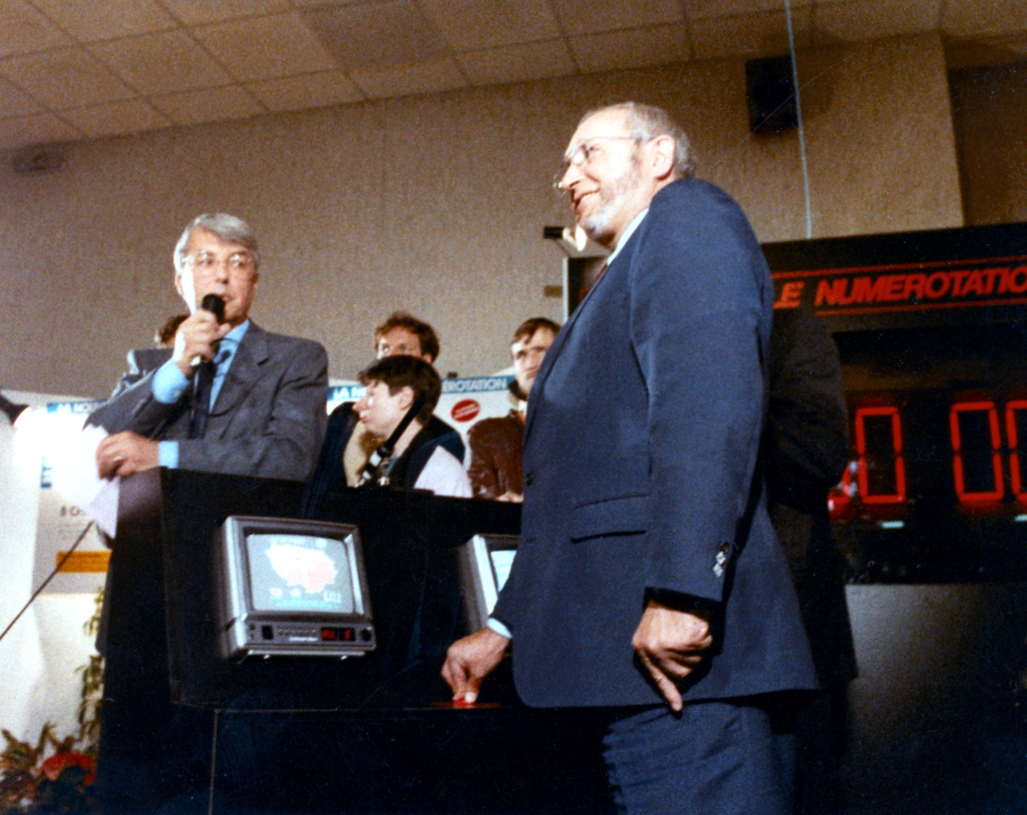 - M. le Ministre-délégué chargé des PTT – Louis Mexandeau appuie symboliquement sur le bouton rouge, représentant le passage à la Nouvelle Numérotation à 8 chiffres.