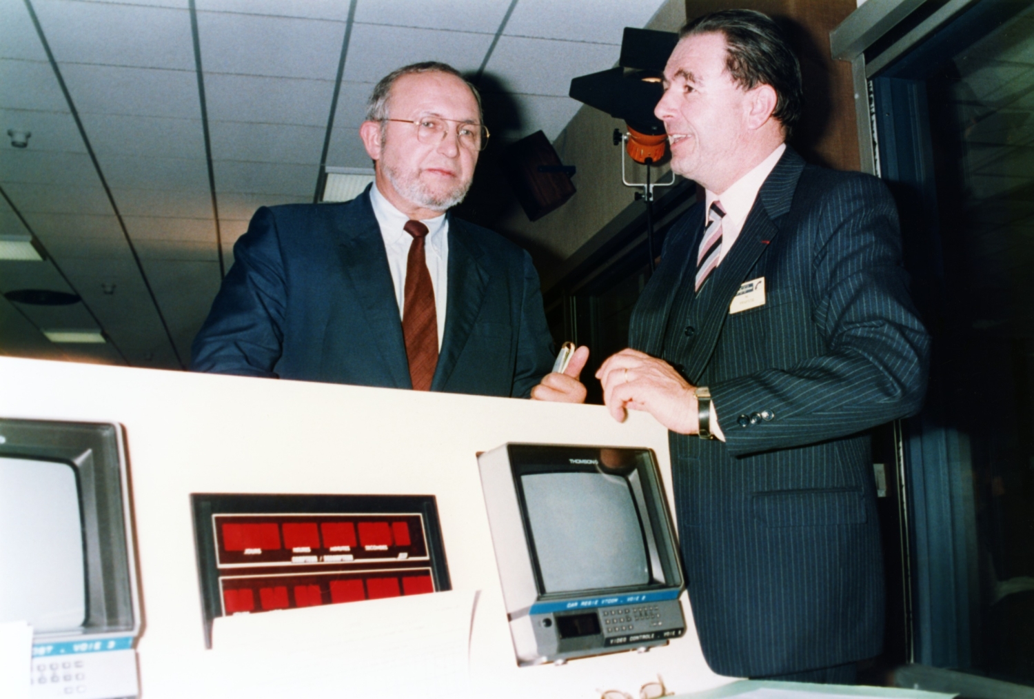 - de gauche à droite : M. le Directeur de la Production – Jean-claude Mailhan, M. François-Henri de Virieu, M. le Ministre-délégué chargé des PTT – Louis Mexandeau et M. le Directeur Général des Télécommunications – Jacques Dondoux.