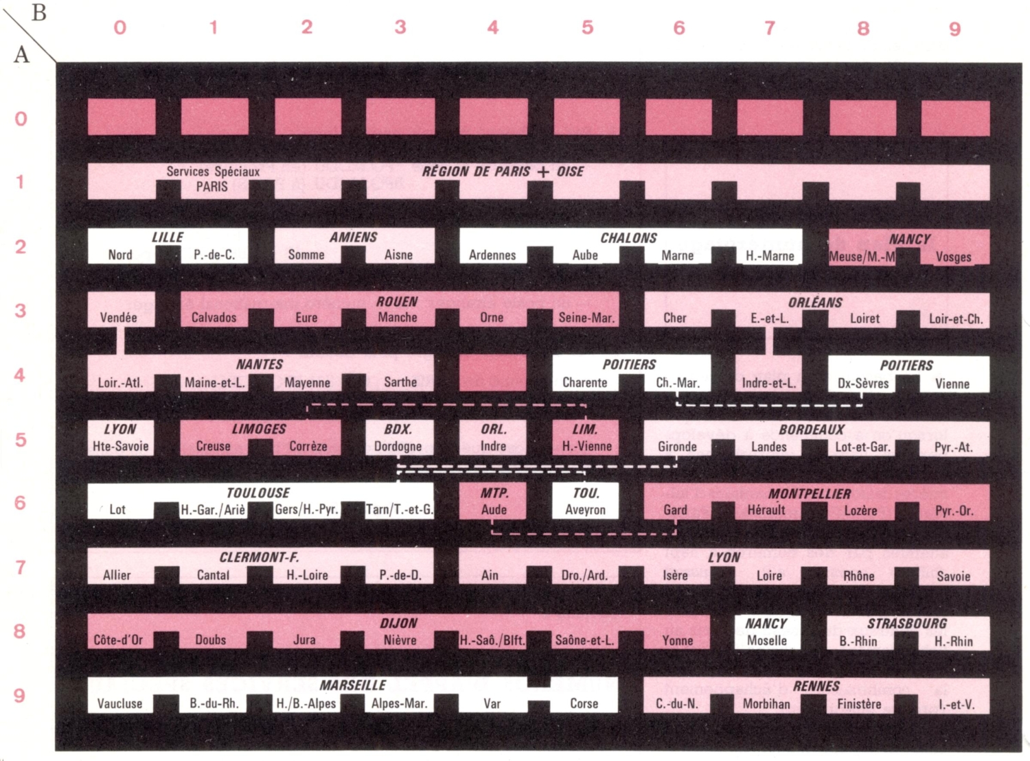 Ci-dessus : Plan des indicatifs interurbains AB en vigueur vers 1975-76.