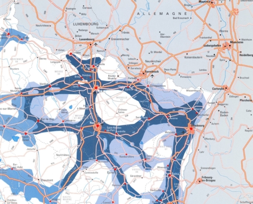 - Nota : la surface couverte est représentée en utilisant un téléphone 8 watts, ce qui donne un Débit d’Absorption Spécifique majeur pour les utilisateurs (rayonnements radio-électriques). La couverture étant beaucoup moins étendue avec un simple téléphone 2 watts à cette époque.