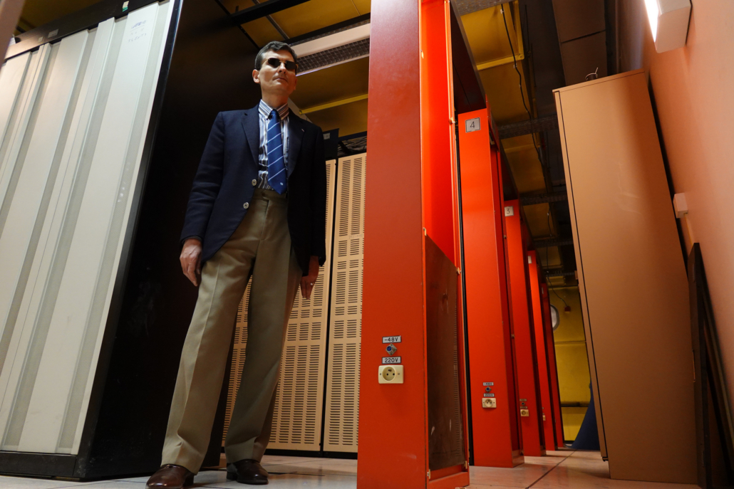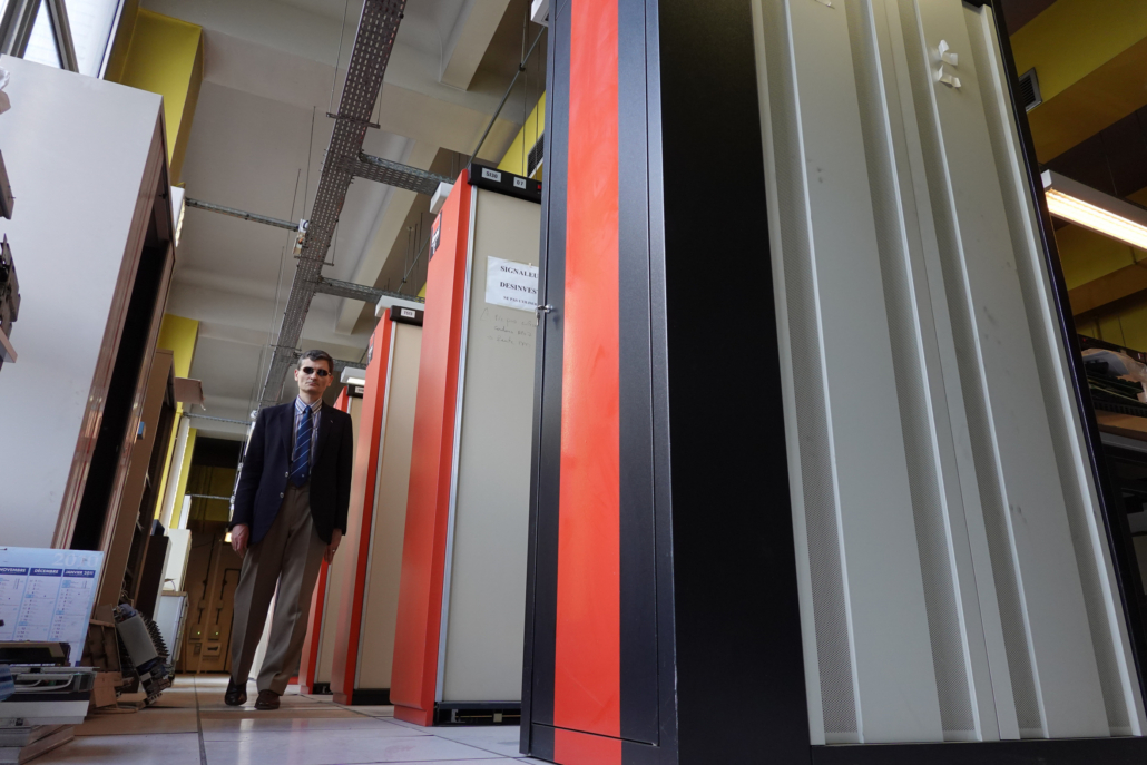 - Au delà et jusqu’au fond de la salle, les 5 travées des Centres Satellites Numériques (CSN), positionnées perpendiculairement, pour cause d’exiguïté de la salle, dans leur mobilier dédié « Alcatel ».