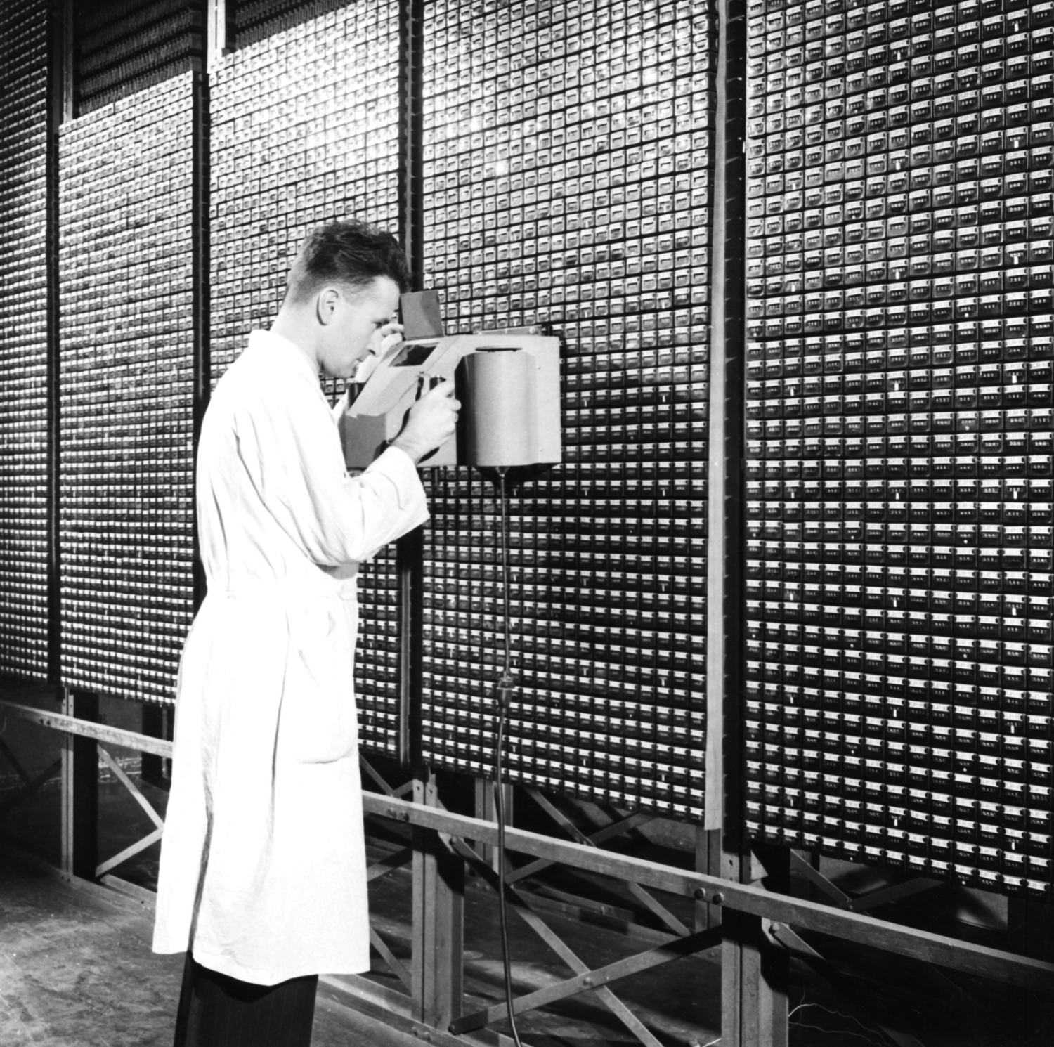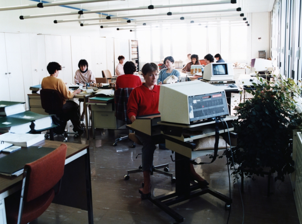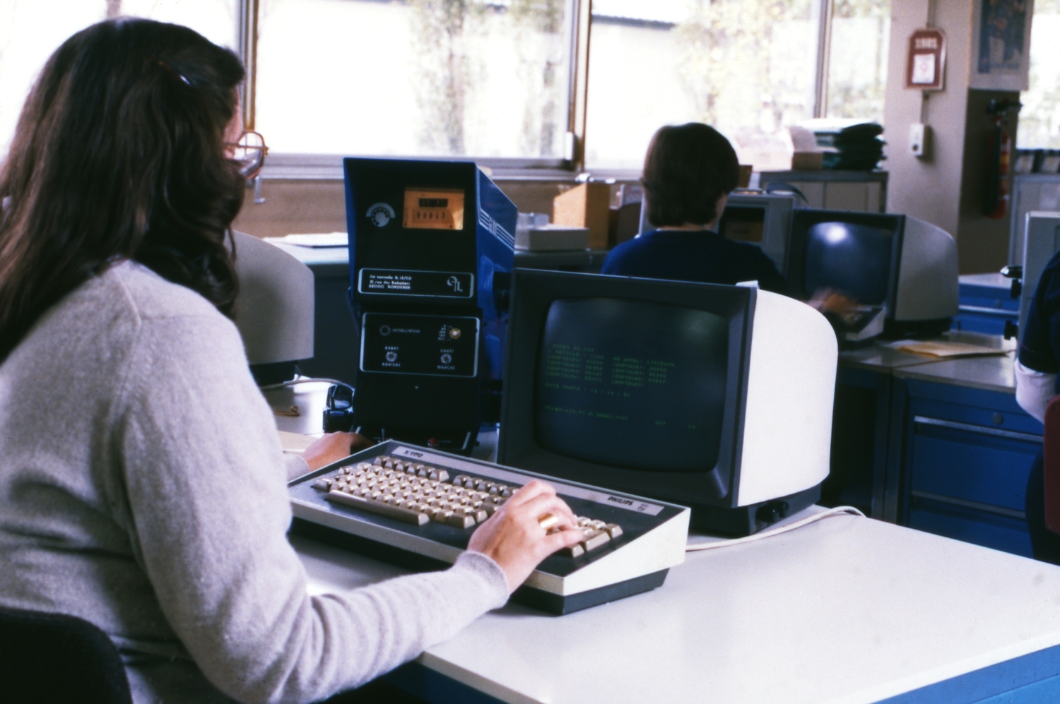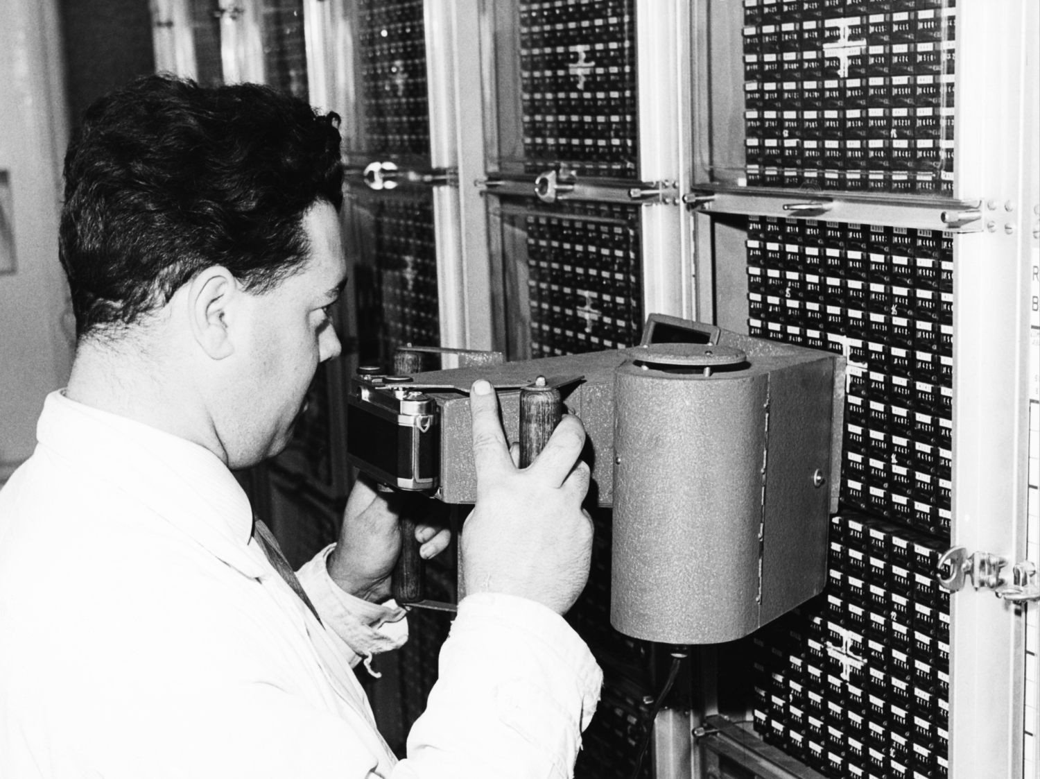 Ci-dessus : à partir des années 1970, encodage des photographies des compteurs de taxations des lignes téléphoniques.