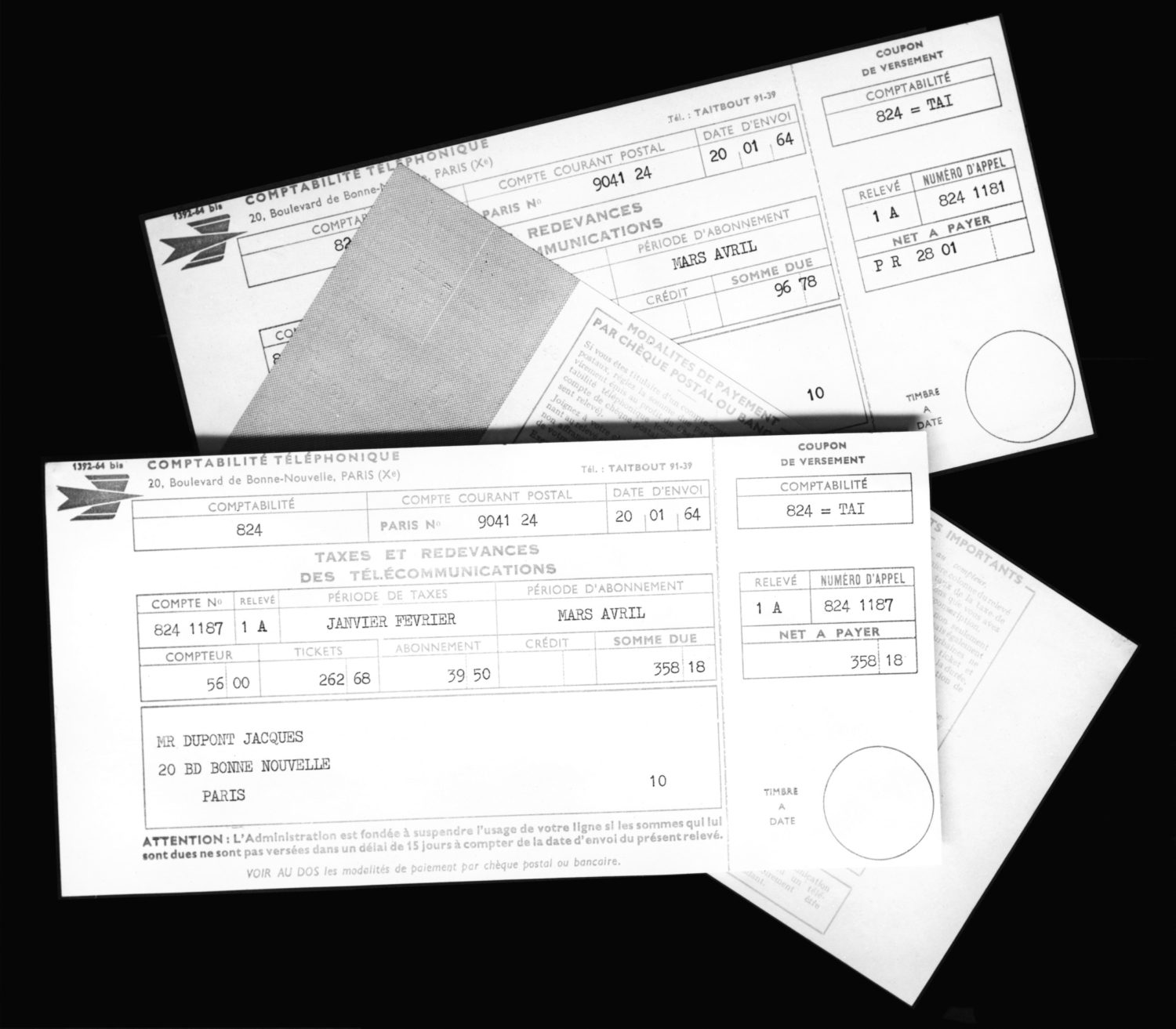 Ci-dessus : Factures bimestrielles des Télécommunications du 20 janvier 1964, émises par le Centre Régional de Mécanographie des Télécommunications de Paris (Bonne-Nouvelle). Documents PTT – Coll. C. R-V.