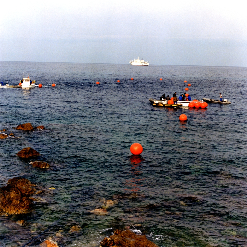 Ci-dessus : navire câblier Raymond Croze et ses équipes, à proximité de L’Île-Rousse (Isula Rossa) pendant la pose du câble sous-marin de télécommunications à fibre optique entre Cannes et L’Île-Rousse (câble CC4) –